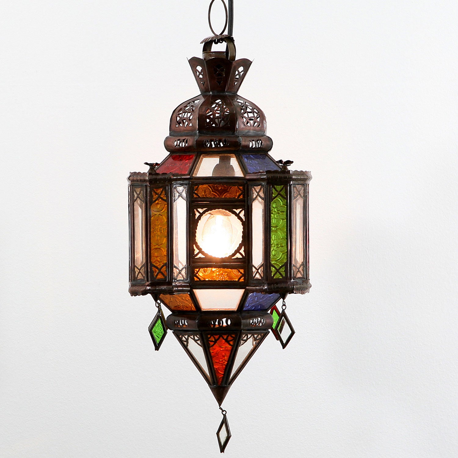 Il “Moulawlidat” è uno Lanterna araba / Lampada a sospensione in uno stile classico, che colpisce per la sua elaborata lavorazione artigianale e la bella luce. È realizzata in ferro con aspetto acciaio inossidabile e vetro colorato/ornamentale in rilievo. Dispone di quattro vetrate che possono essere aperte e offrono la possibilità di utilizzare lumini.