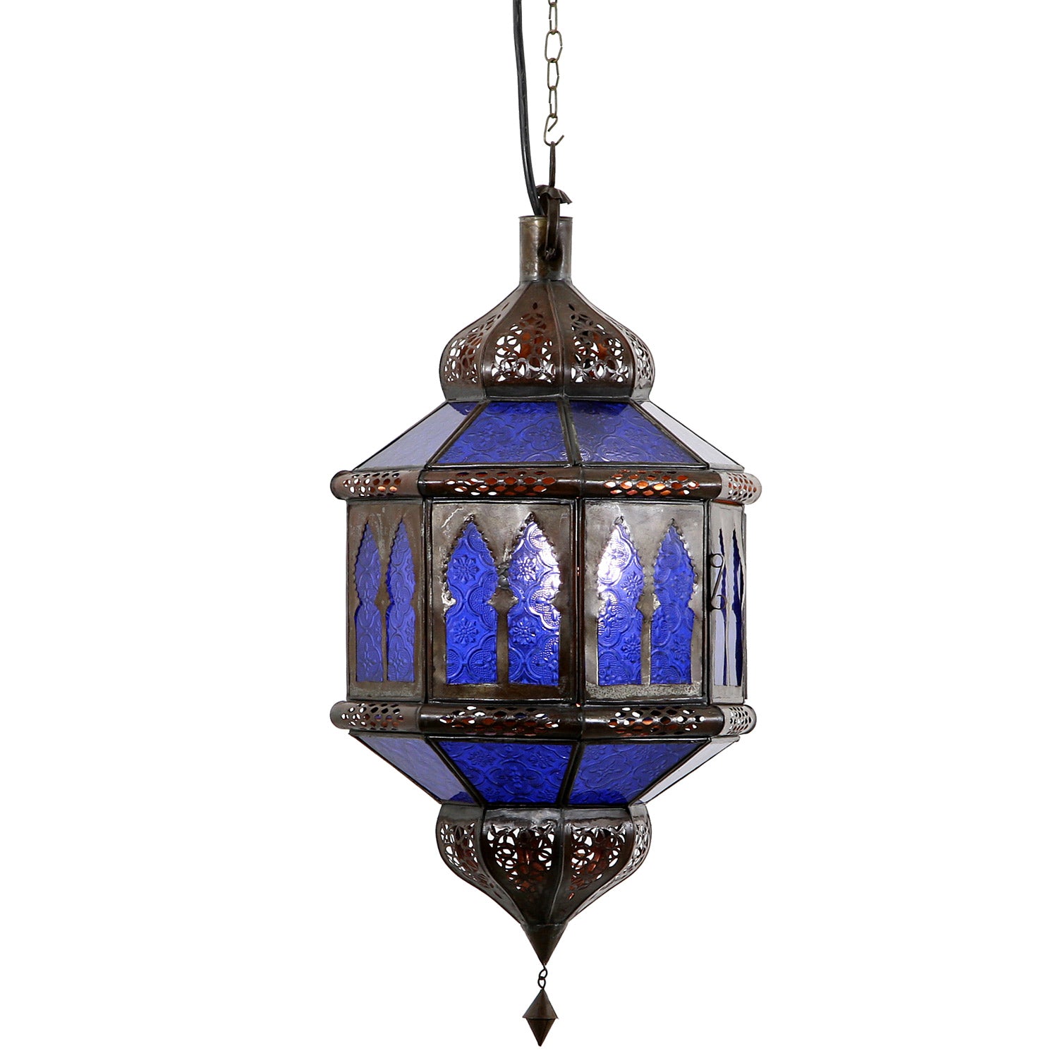 Il colorato, Lanterna araba/lampada a sospensione garantisce sempre un'atmosfera rilassante e un ambiente con luci calde. È finemente lavorato a mano ed è composto da ferro color ruggine e vetro colorato trasparente/a rilievo inserito. Le punzonature nel ferro lo supportano orientale Vena della “Trombia”.