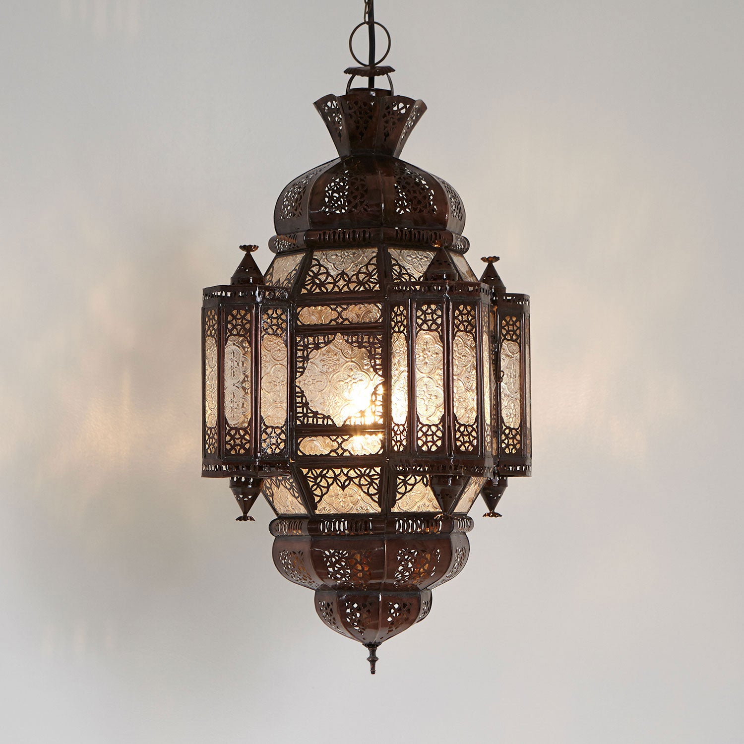 Il “Moula-Maurice” riflette l'Oriente in ciascuno dei suoi modelli. I ritagli elaborati si armonizzano molto bene con il vetro trasparente utilizzato. Questo Lanterna marocchina / Lampada a sospensione dispone di quattro finestre a bovindo che possono essere aperte e offrono la possibilità di utilizzare lumini.