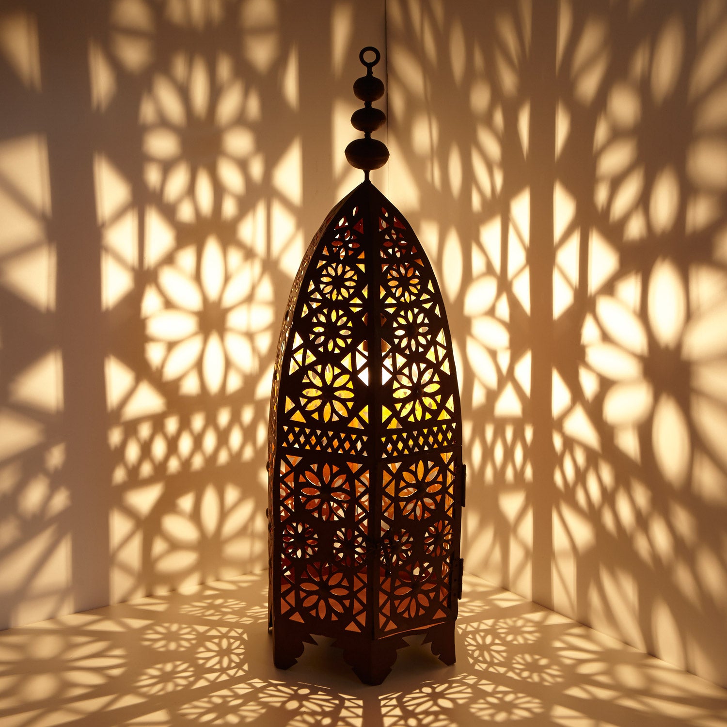 Questo orientale Lanterna crea un affascinante gioco di luci e ombre. La struttura in metallo è realizzata artigianalmente ad arte utilizzando tecniche quali il taglio o l'incisione con filigrana, orientale Decorato con ornamenti. Utilizzando una chiusura, è possibile aprire un lato per posizionare la lampada. È possibile utilizzare sia l'illuminazione elettrica che quella a candela.