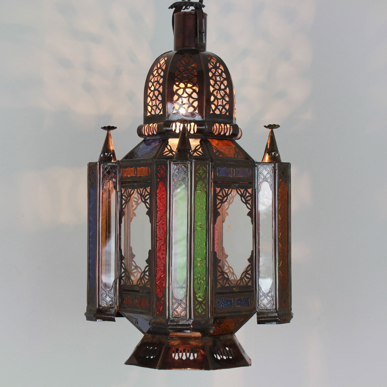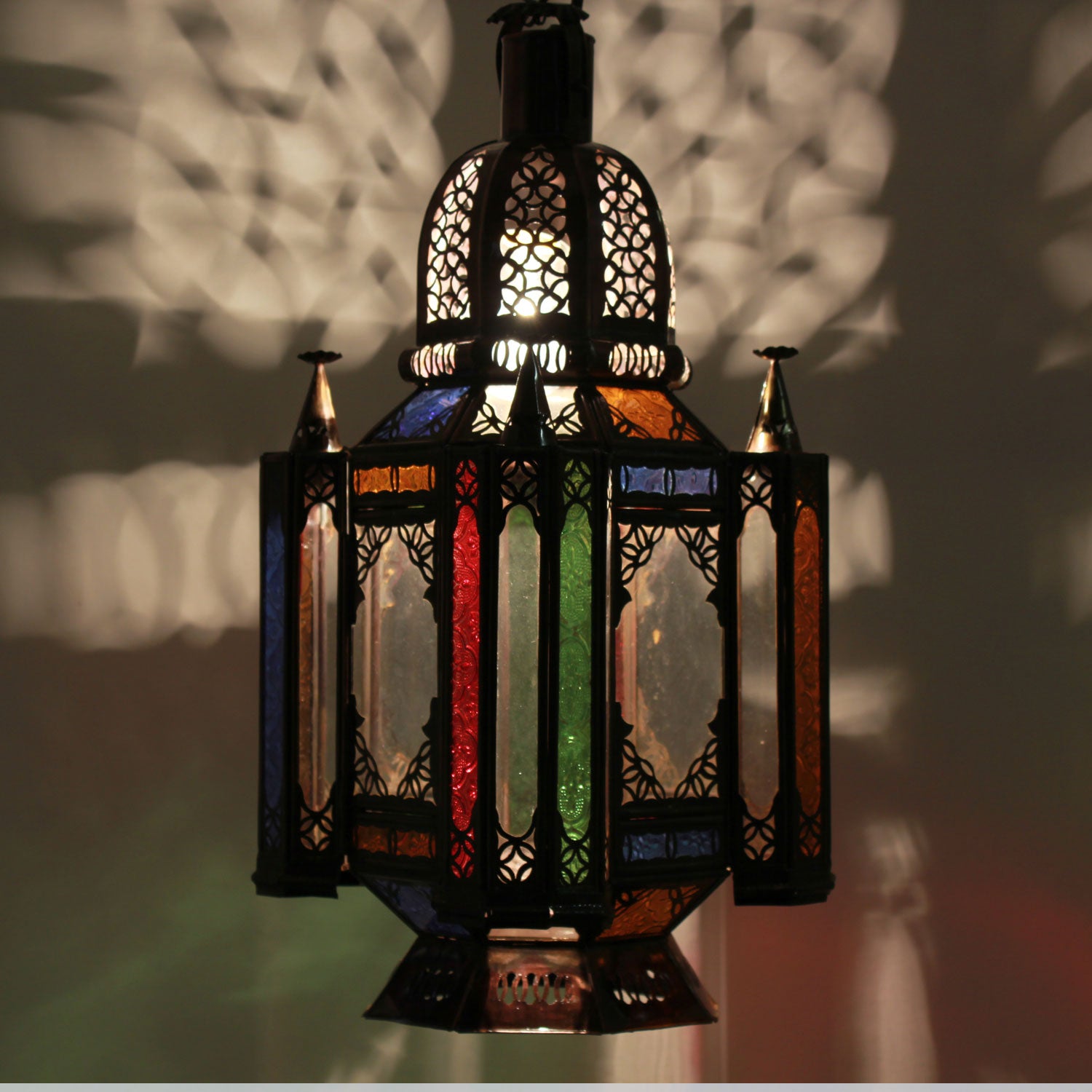 La “Fadila” è una Lanterna araba/lampada a sospensione in uno stile classico, che colpisce per la sua elaborata lavorazione artigianale e la bella luce. È realizzata in ferro con aspetto acciaio inossidabile e vetro colorato/ornamentale in rilievo. È adatto sia per l'illuminazione elettrica che per l'illuminazione a candela. Inoltre, può essere utilizzato anche come Lanterna da terra essere utilizzato.