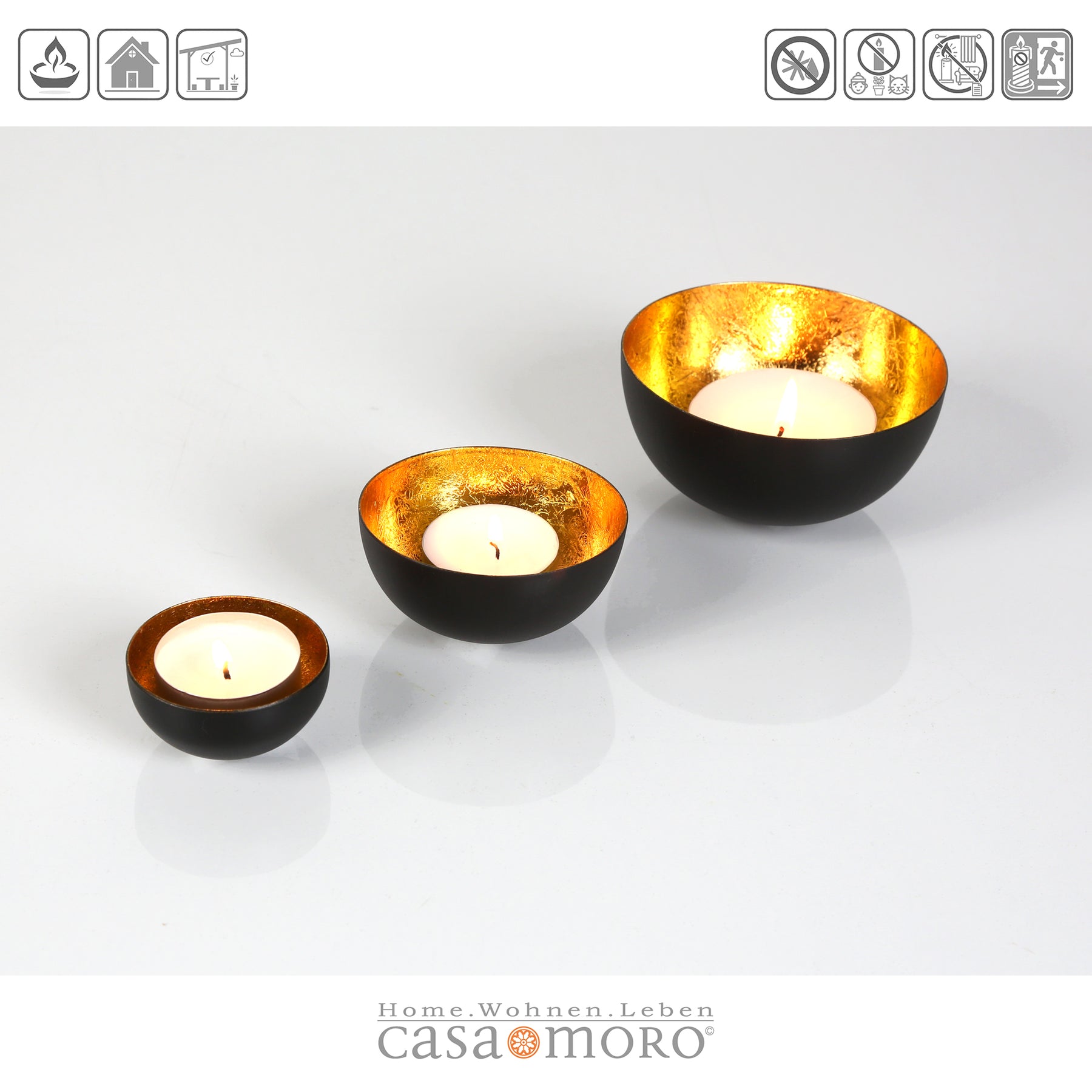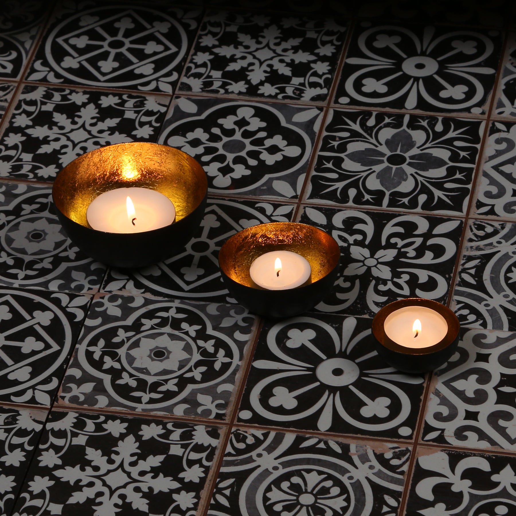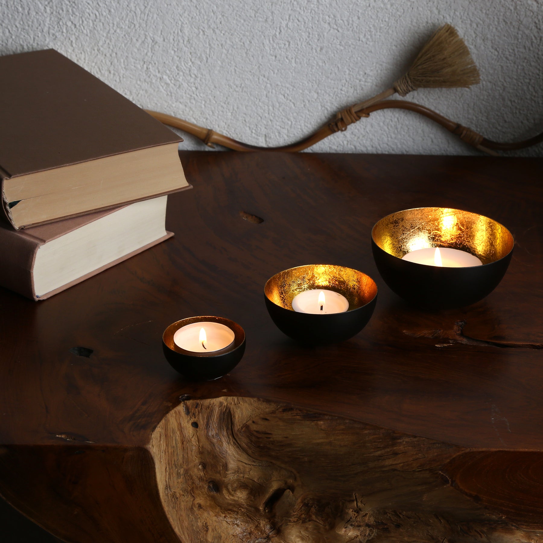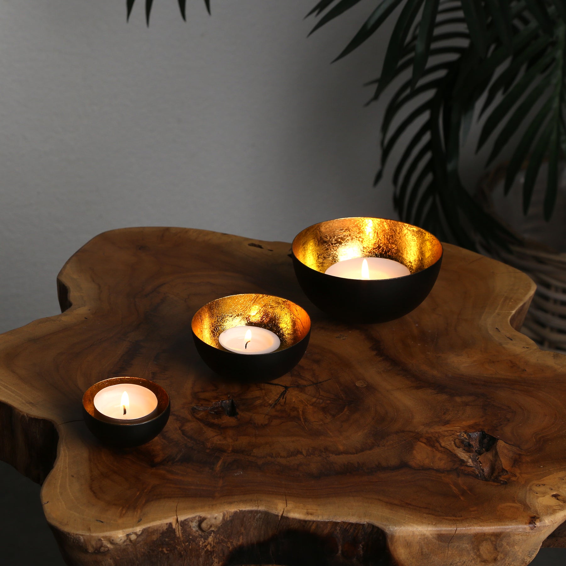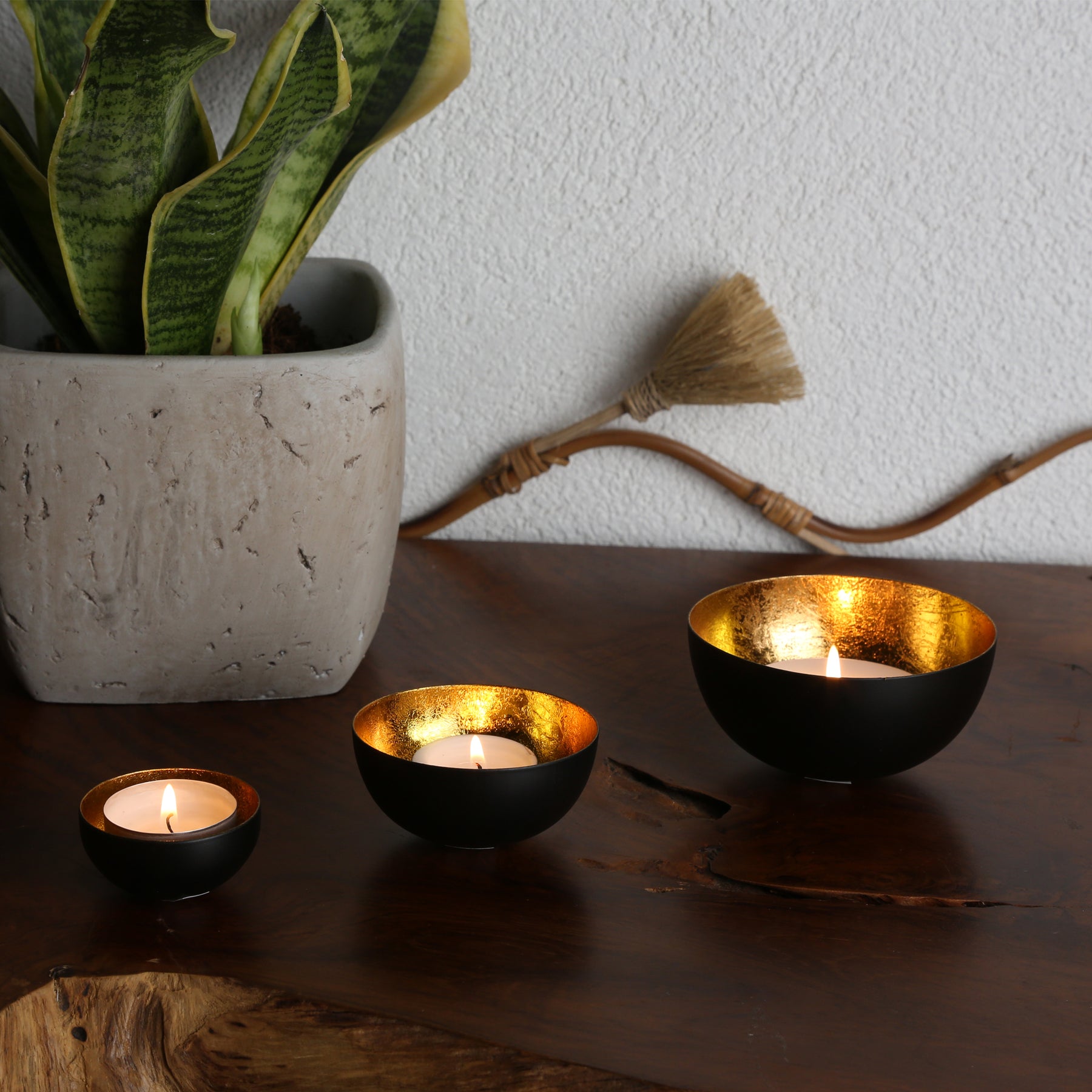 Schwarz-Gold: Ein edles Duo. Das elegante Set besteht aus drei unterschiedlich großen Teelicht-Schalen, die aus robustem Metall gefertigt und von Hand veredelt wurden. Die Außenseite besticht durch ein mattes Schwarz, während die Innenseite in einem edlen Goldton schimmert. Perfekt als stilvoller Blickfang für jedes Zuhause!