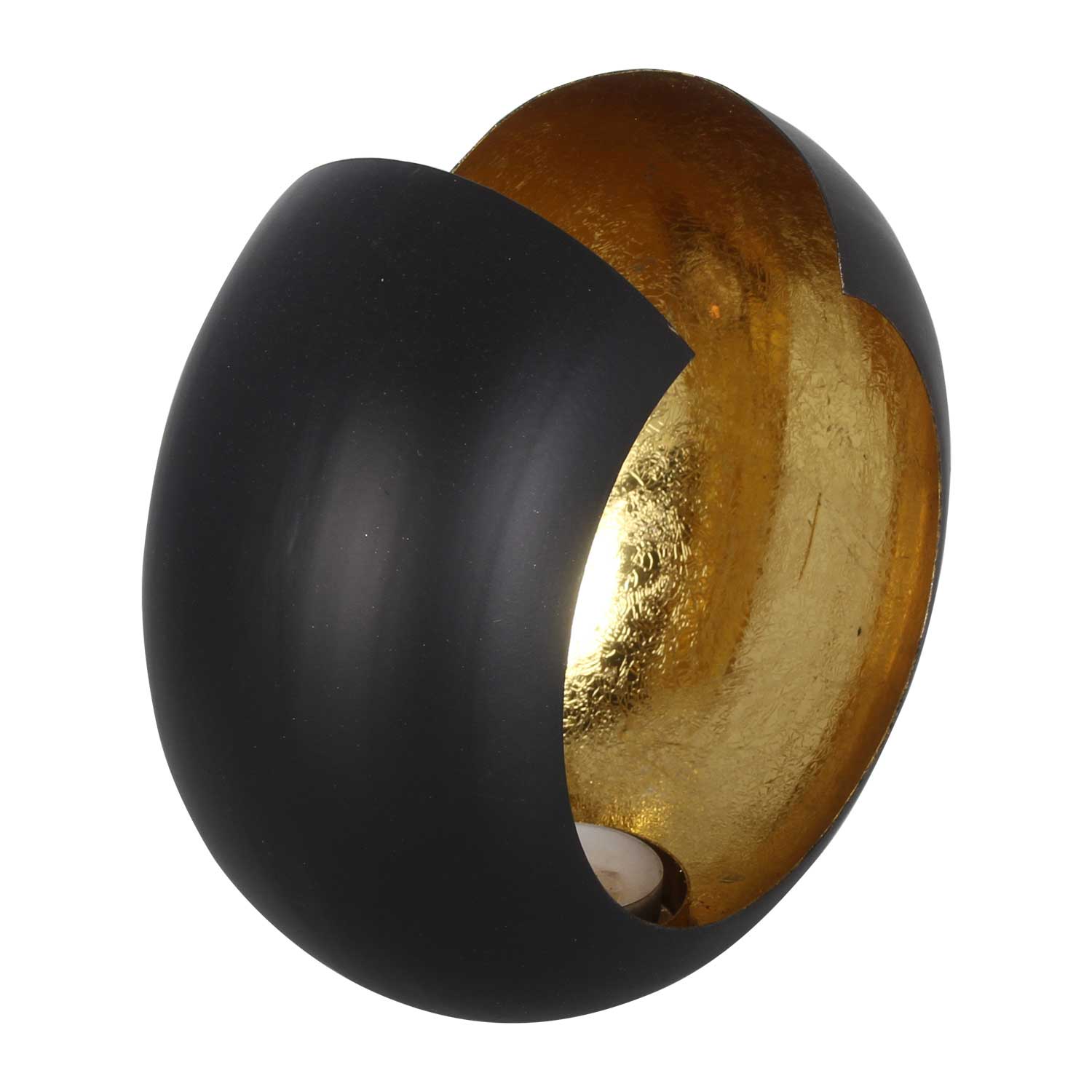 Der orientalische Kerzenhalter ist Außen in Schwarz und Innen mit Goldfolieauskleidung lackiert, dadurch wirkt der Untergrund "verknittert", und das Kerzenlicht wird mehrfach gebrochen. Der Teelichthalter strahlt Wärme und Freundlichkeit aus und verbreitet eine stimmungsvolle Atmosphäre – Ideal für Abende zu zweit, mit Freunden, mit der Familie oder als Partydeko.