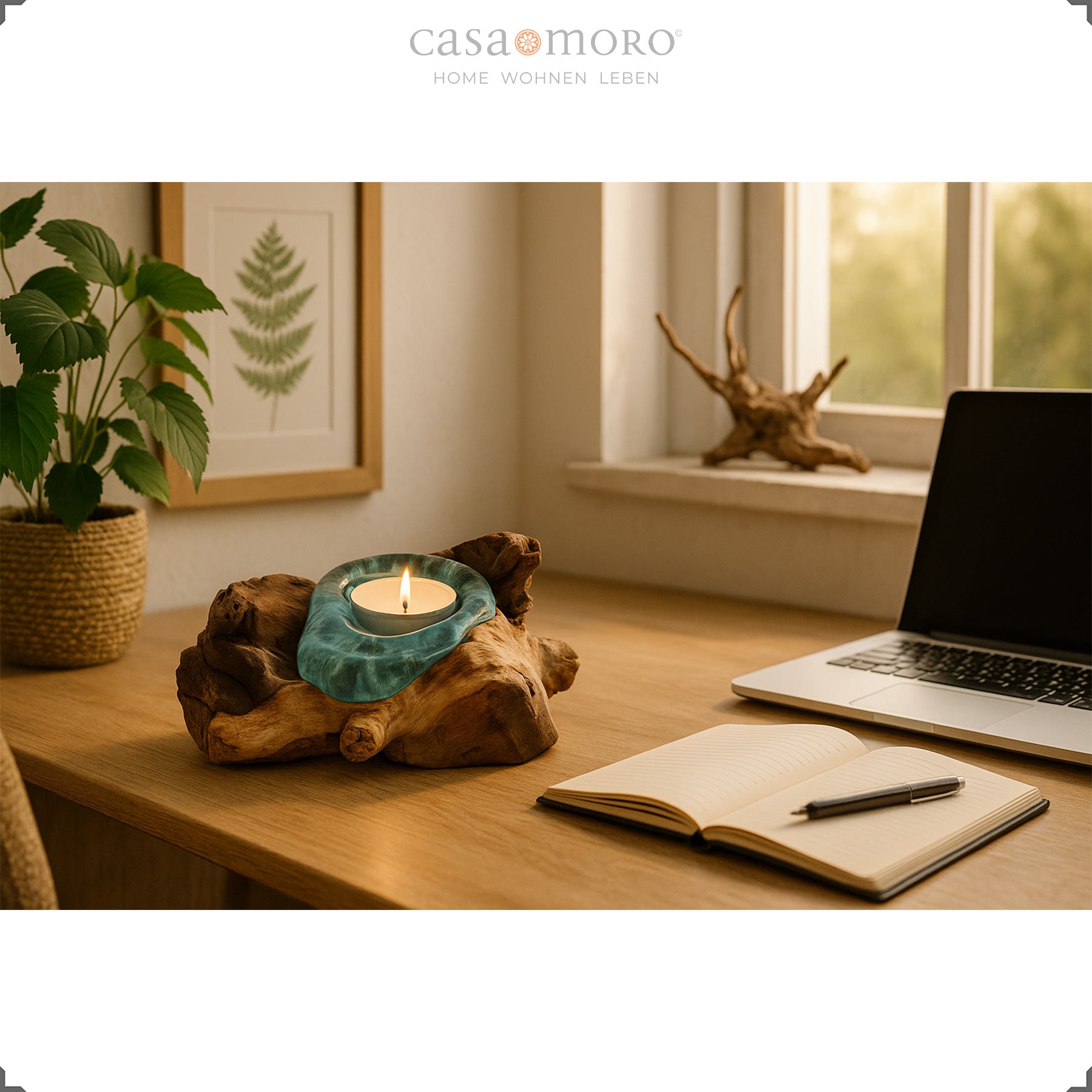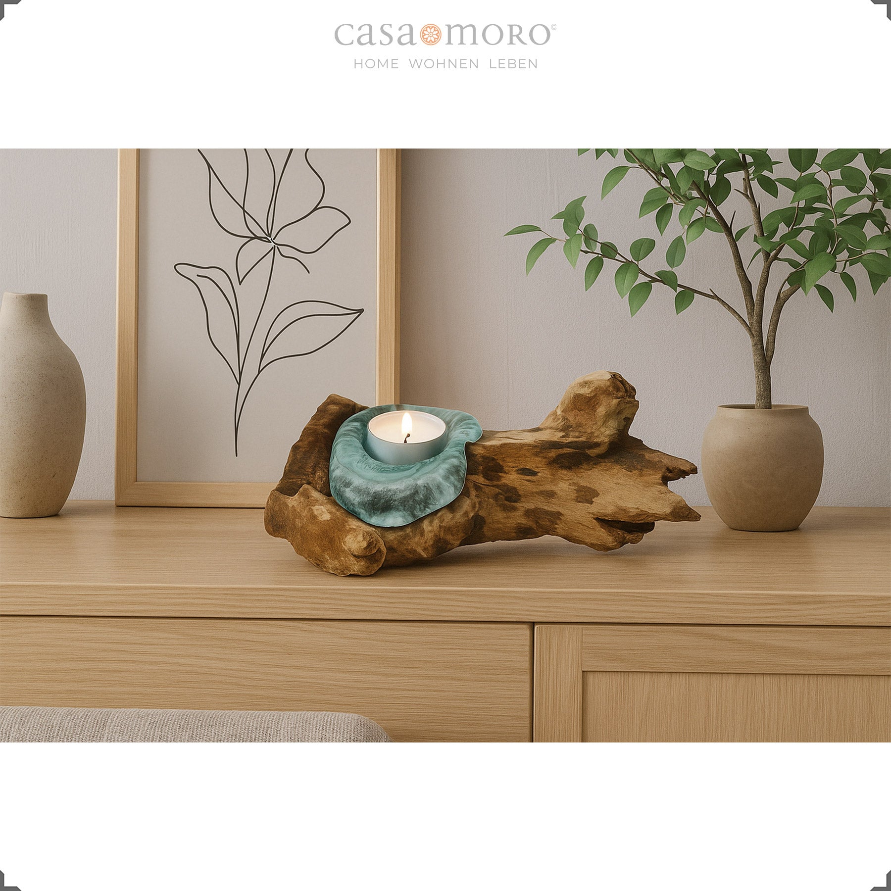 Jedes Stück ist ein Unikat – von der Struktur des Wurzelholz über die Maserung bis hin zu den leichten Schlieren im Glas. Genau diese Eigenheiten machen den Charme dieses Teelichthalters aus Glas und Holz aus und lassen ihn natürlich wirken. Ob auf dem Sideboard, der Fensterbank oder als ruhiger Akzent auf dem Tisch: Dieses kleine Objekt bringt ästhetische Gelassenheit in Dein Zuhause.