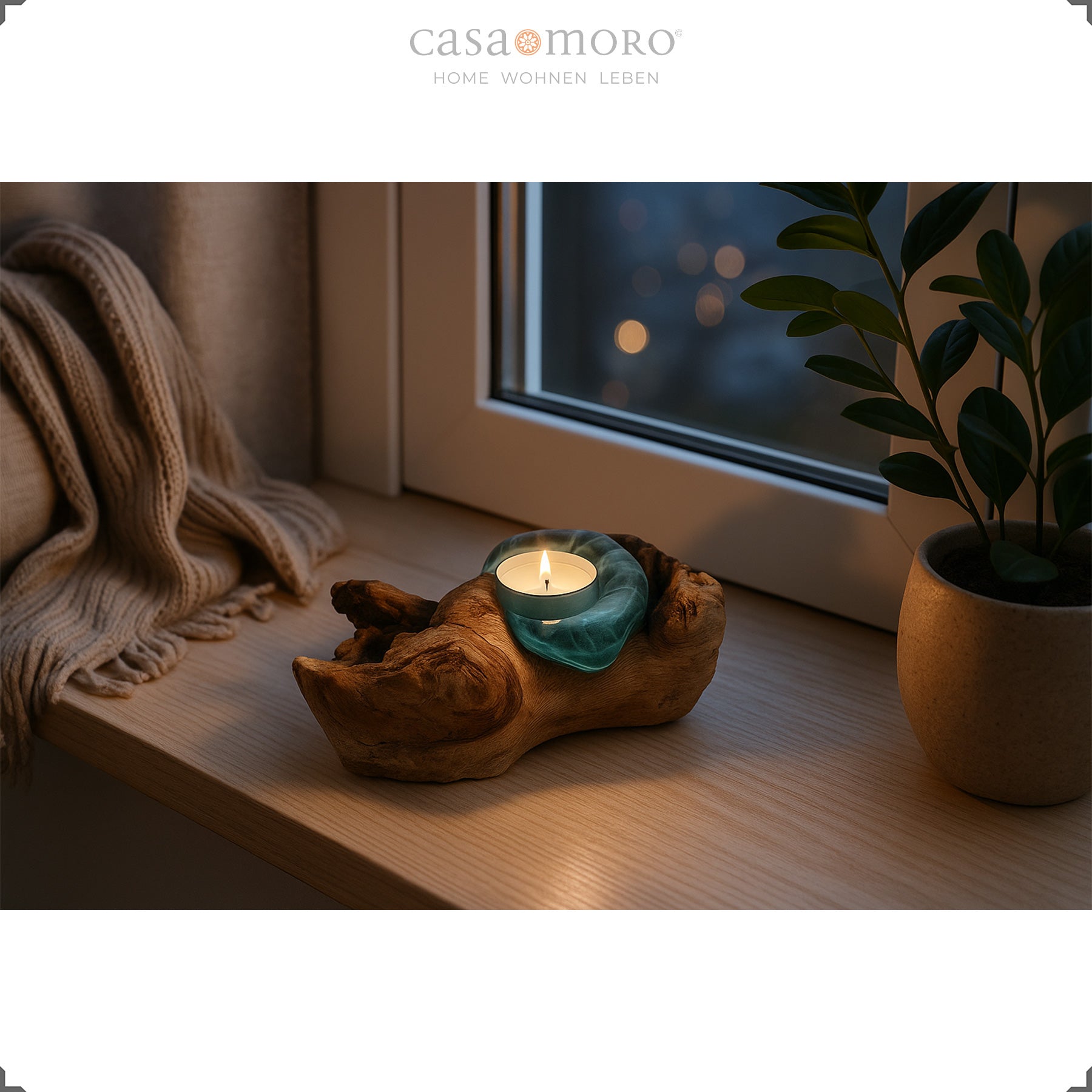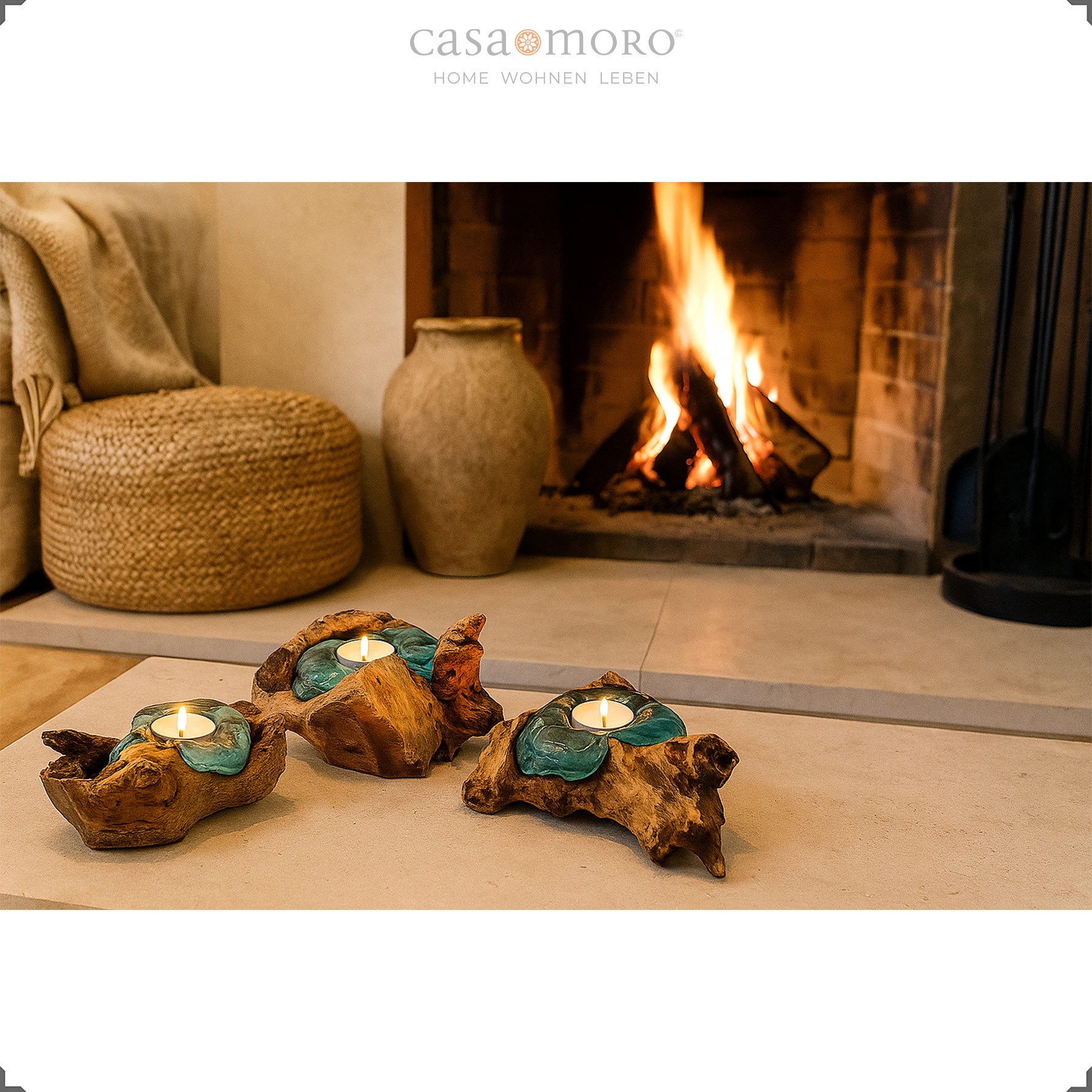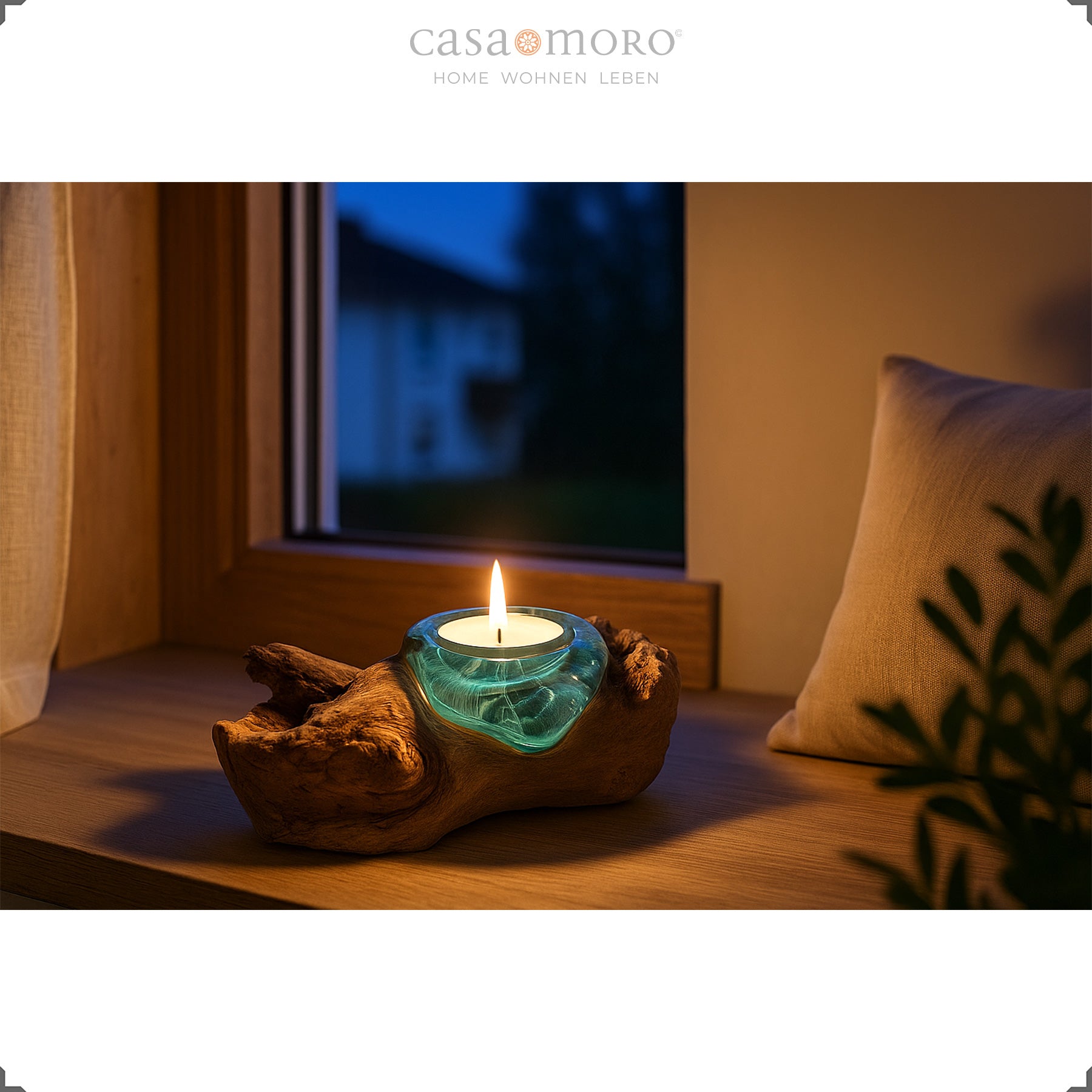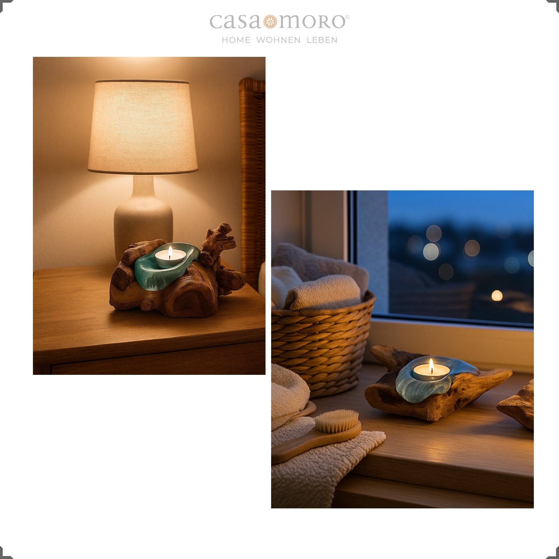 Die geschwungene Holzschale fängt das Kerzenlicht auf und reflektiert es weich. So entsteht ein harmonisches Lichtspiel, das jeden Raum behaglicher wirken lässt. Mit seiner Verbindung aus Teakholz Stamm, Glas und handwerklicher Verarbeitung fügt sich der Teelichthalter mühelos in verschiedene Wohnstile ein – von modern-natürlich bis warm und erdverbunden.