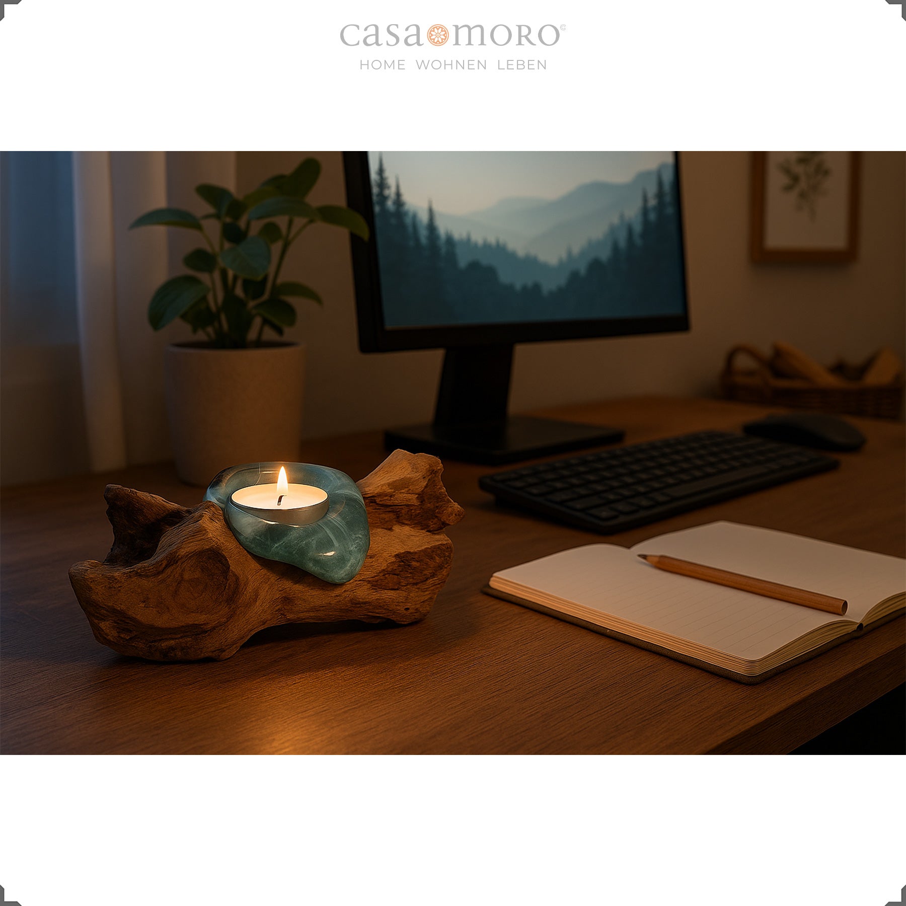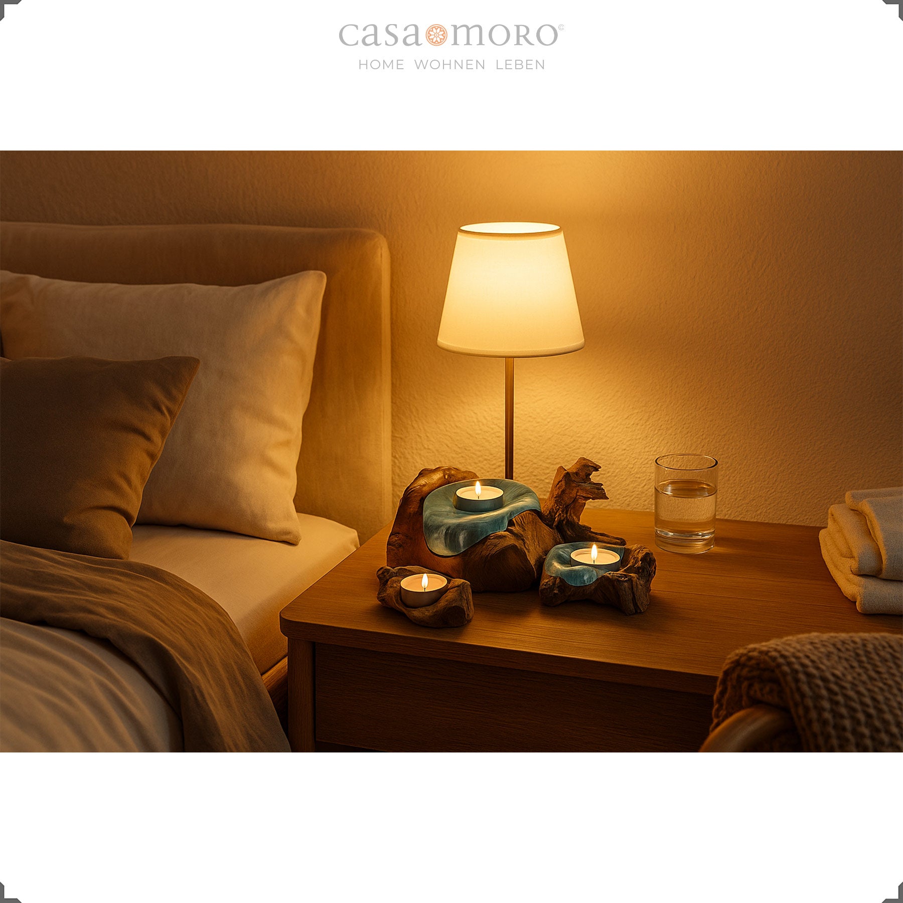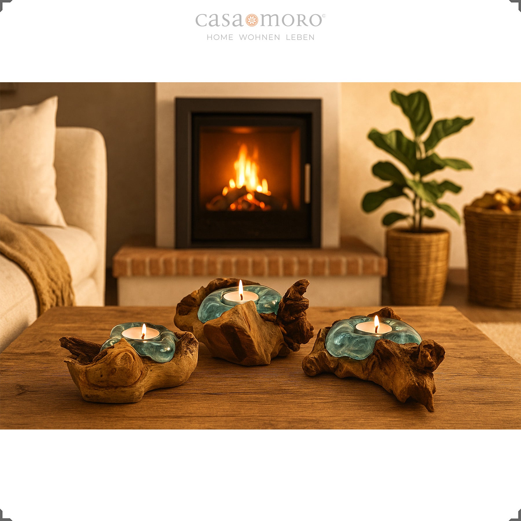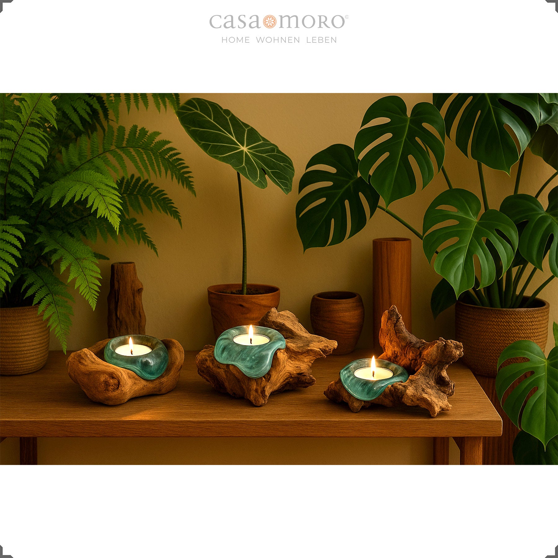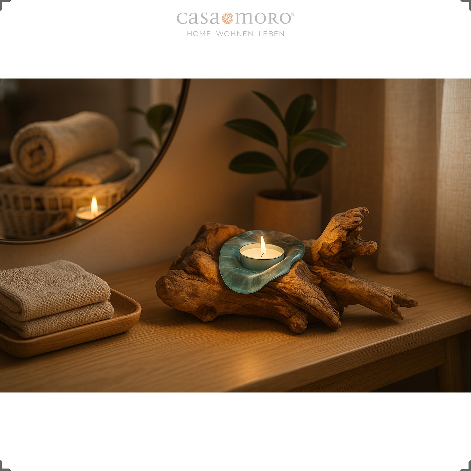 Die geschwungene Holzschale fängt das Kerzenlicht auf und reflektiert es weich. So entsteht ein harmonisches Lichtspiel, das jeden Raum behaglicher wirken lässt. Mit seiner Verbindung aus Teakholz Stamm, Glas und handwerklicher Verarbeitung fügt sich der Teelichthalter mühelos in verschiedene Wohnstile ein – von modern-natürlich bis warm und erdverbunden.