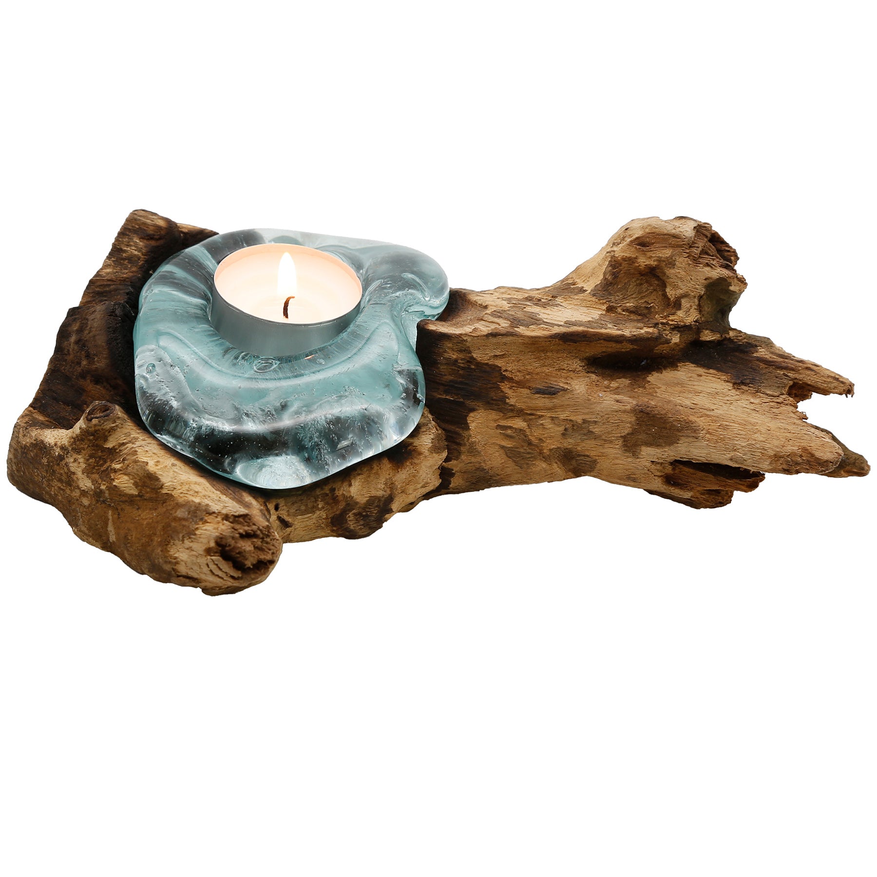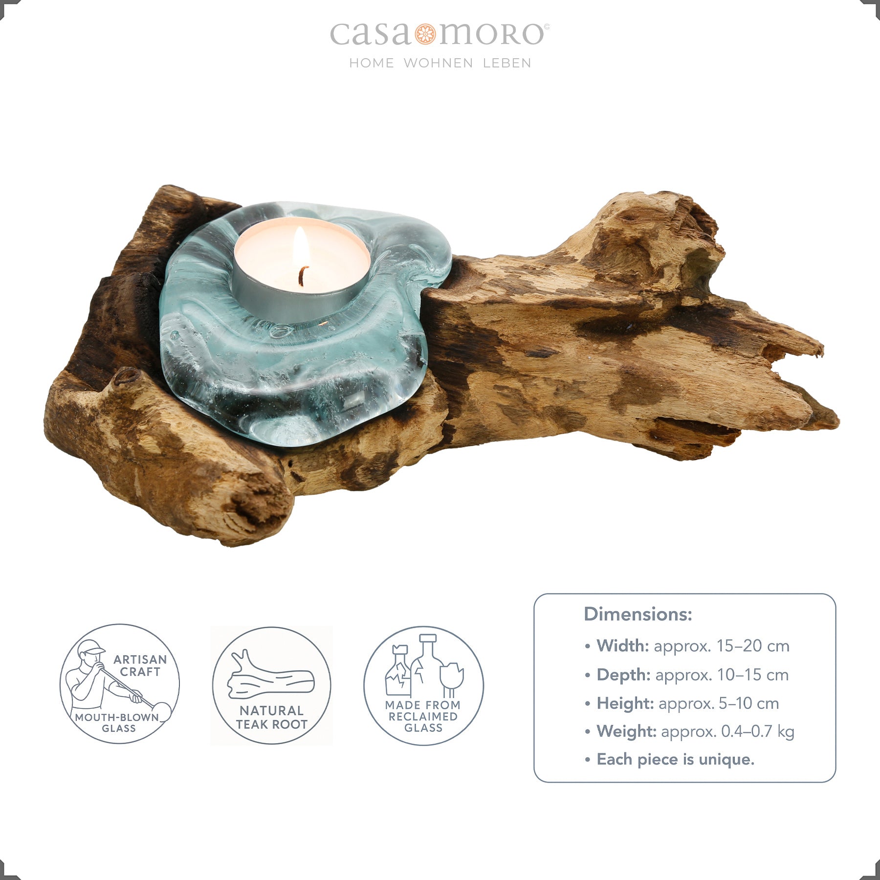 Gefertigt aus geschmolzenem Glas, das im heißen Zustand direkt auf einen Teakholz Stamm gelegt wird, entsteht eine Form, die sich organisch an die Linien des Holzes anschmiegt. Das Zusammenspiel aus Glas und Wurzelholz lässt das Teelicht weich schimmern und erzeugt eine stimmungsvolle Atmosphäre, die besonders am Abend zur Geltung kommt.