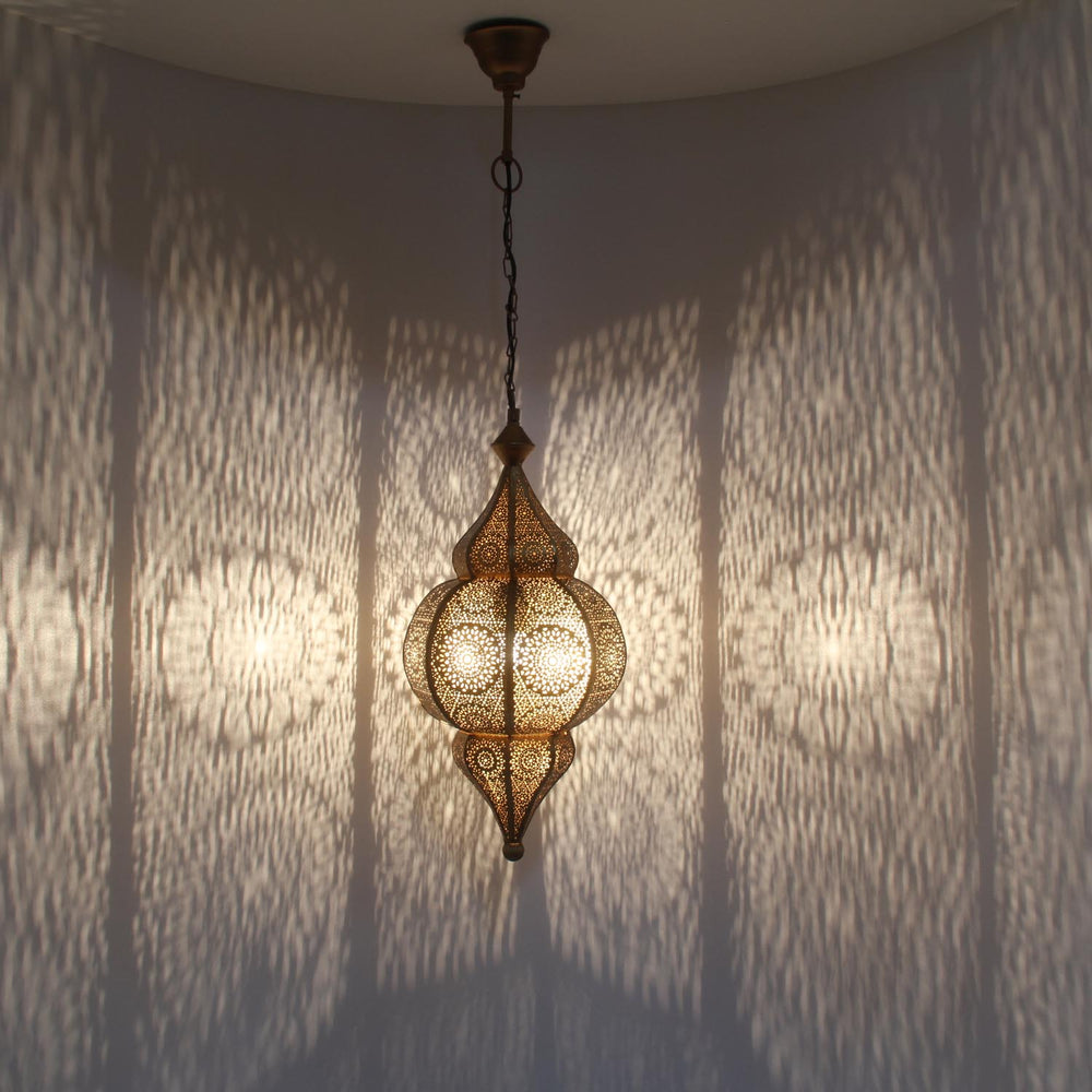 Orientalische Lampen zaubern ein Wohnambiente wie aus Tausendundeiner Nacht. Durch ihre warme Beleuchtung und aufwendigen Ornamente entsteht eine Atmosphäre zum Träumen und Entspannen. Filigrane Hängelampen werfen faszinierende Muster an Wände und Decke, die den Raum in ein Meer aus Licht und Schatten tauchen. Ob im Wohnzimmer, Schlafzimmer, Flur oder in der Küche – die exotischen Leuchten fügen sich stilvoll in jede Umgebung ein und werden schnell zum Blickfang.