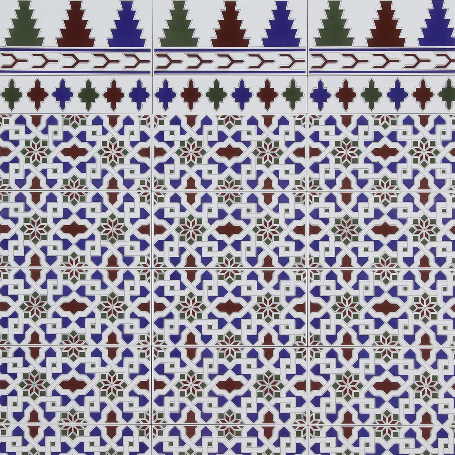 I motivi caratteristici si basano su ornamenti classici dell'Oriente. Forme geometriche ed elementi decorativi stilizzati formano un fregio armonioso che si abbina perfettamente ai rivestimenti marocchini. Ciò crea una transizione decorativa tra le diverse aree delle piastrelle.
