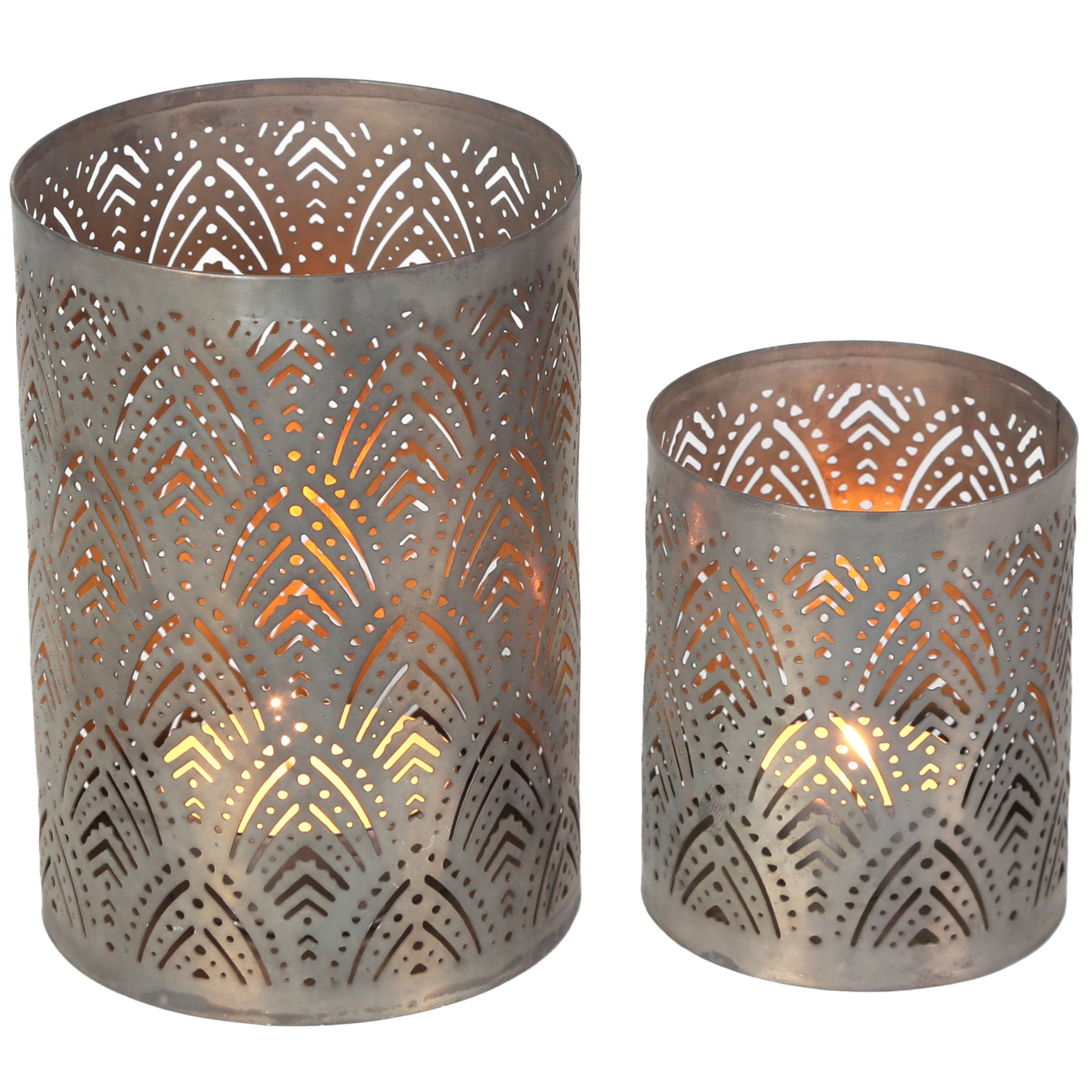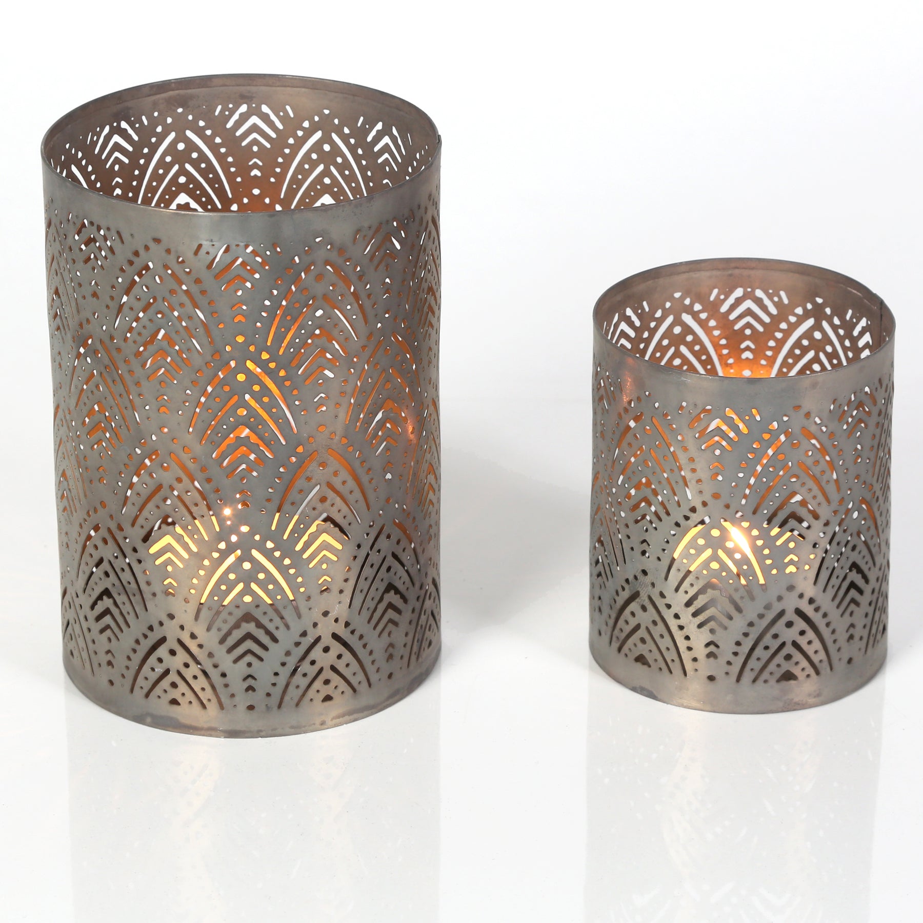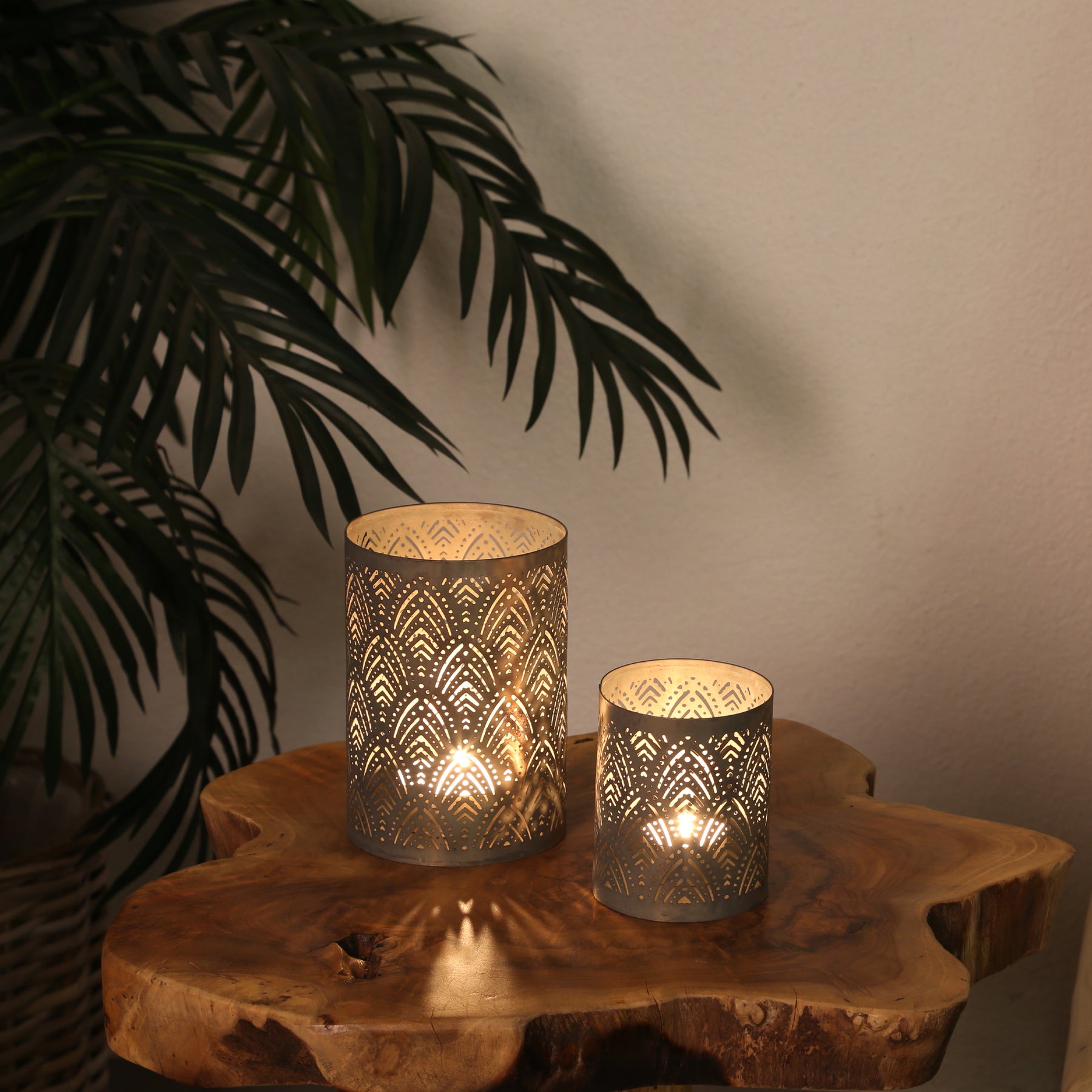 Licht und Schatten perfekt inszeniert. Das stilvolle Set besteht aus zwei unterschiedlich großen Teelichthaltern, die aus robustem Metall gefertigt und in sorgfältiger Handarbeit gestaltet wurden. Die edle bronzefarbene Oberfläche mit einem filigranen Blatt-Muster erzeugt ein stimmungsvolles Lichtspiel und verleiht jedem Raum eine warme und einladende Atmosphäre.