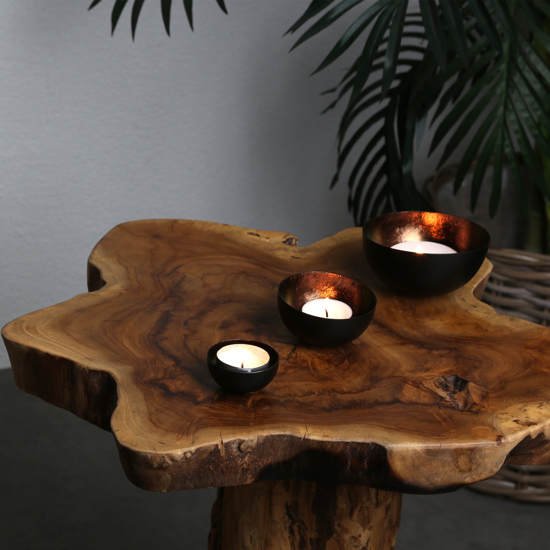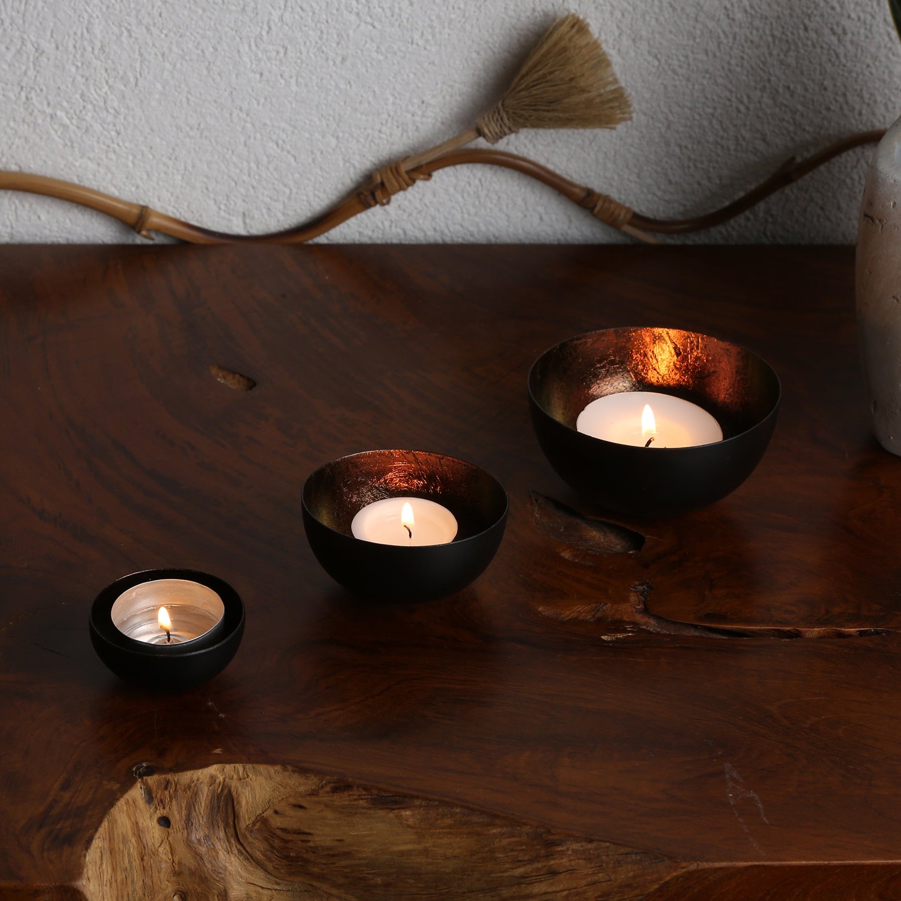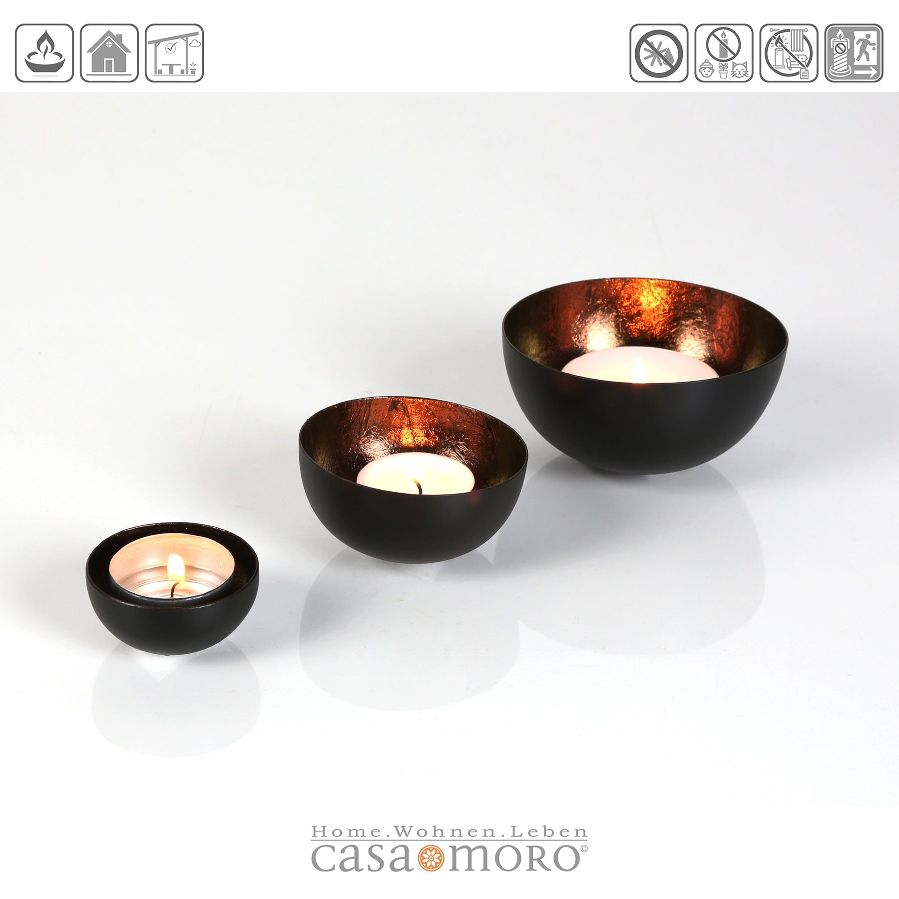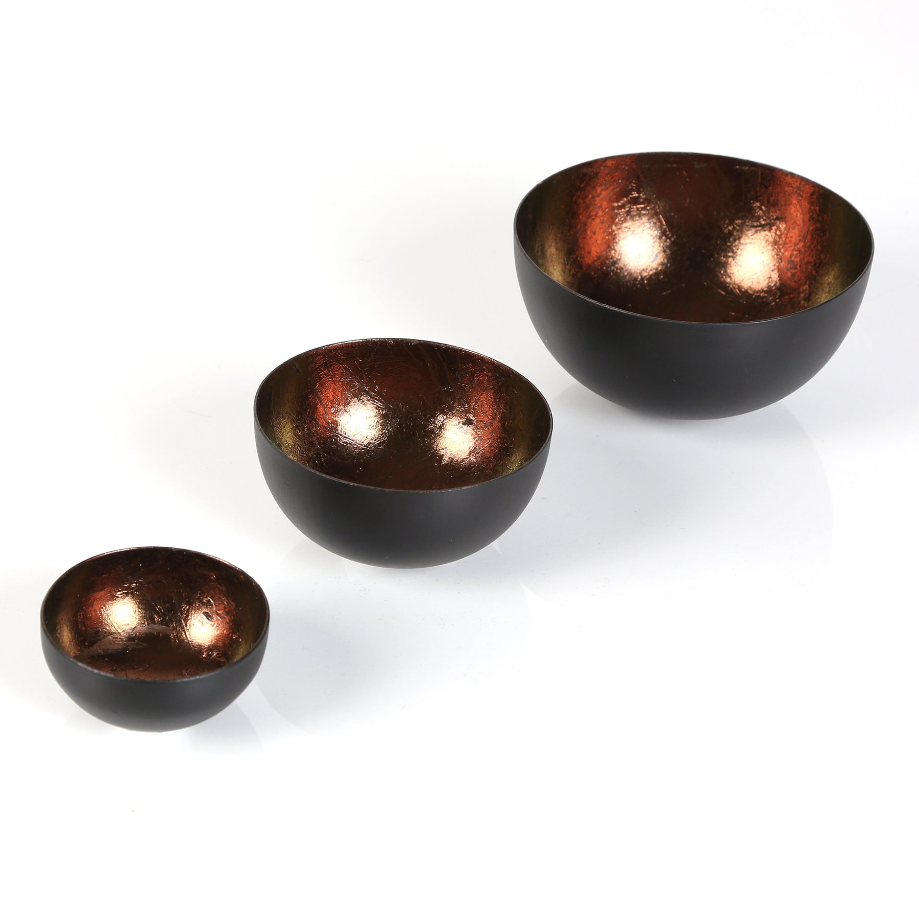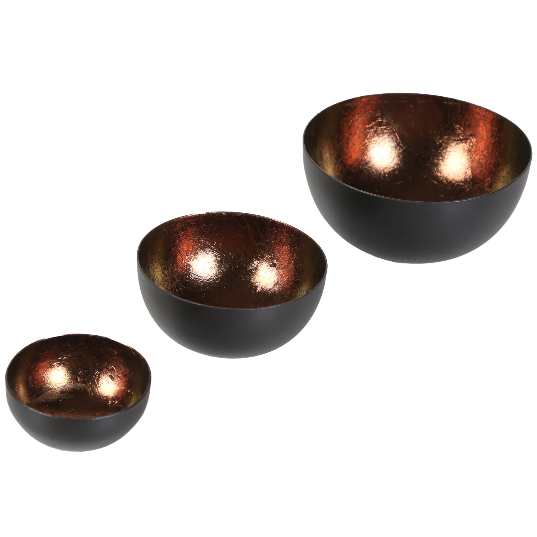 Kontrastreich und faszinierend. Das elegante Set besteht aus drei unterschiedlich großen Teelicht-Schalen, die aus robustem Metall gefertigt und von Hand veredelt wurden. Die Außenseite besticht durch ein mattes Schwarz, während die Innenseite in einem warmen, Braunen Kupferton schimmert. Perfekt als stilvoller Blickfang für jedes Zuhause!