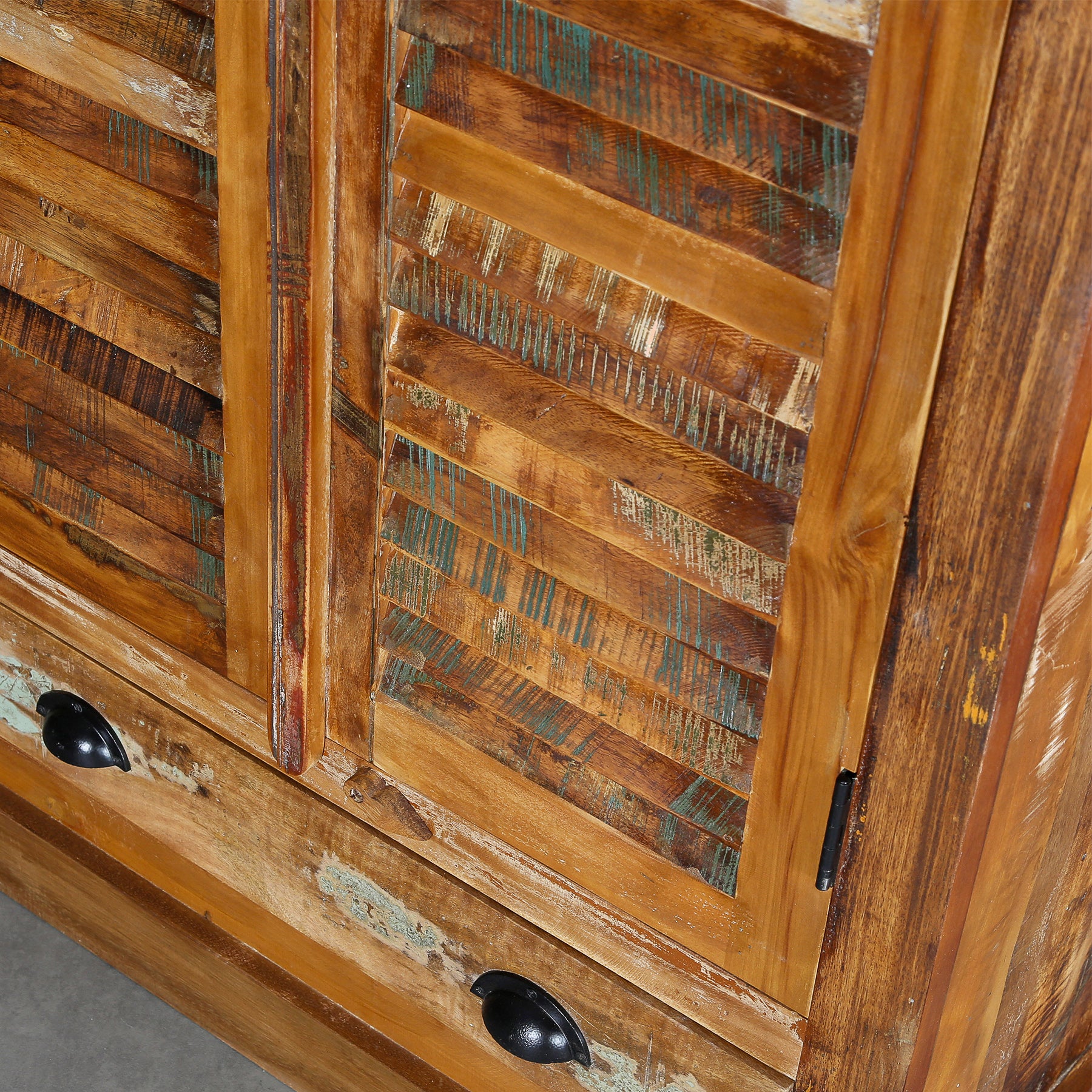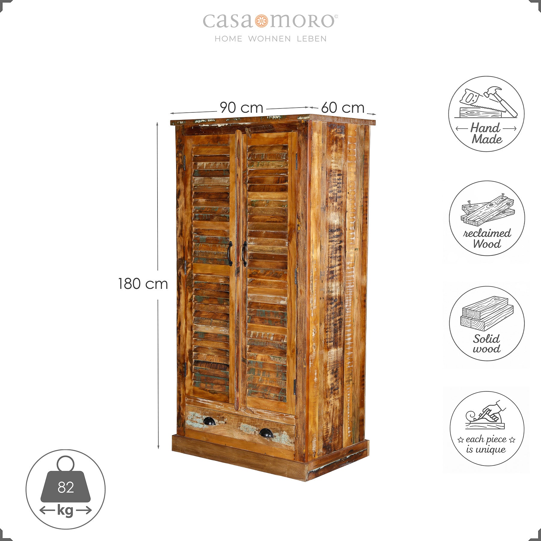 Realizzato in legno di mango recuperato, questo armadio è realizzato con legno già utilizzato: alberi caduti, vecchie barche e travi, pavimenti e travi di sostegno di edifici demoliti. Questa origine si riflette in tracce sottili, lievi cambiamenti di colore e una superficie che non vuole essere liscia, ma piuttosto ha carattere.