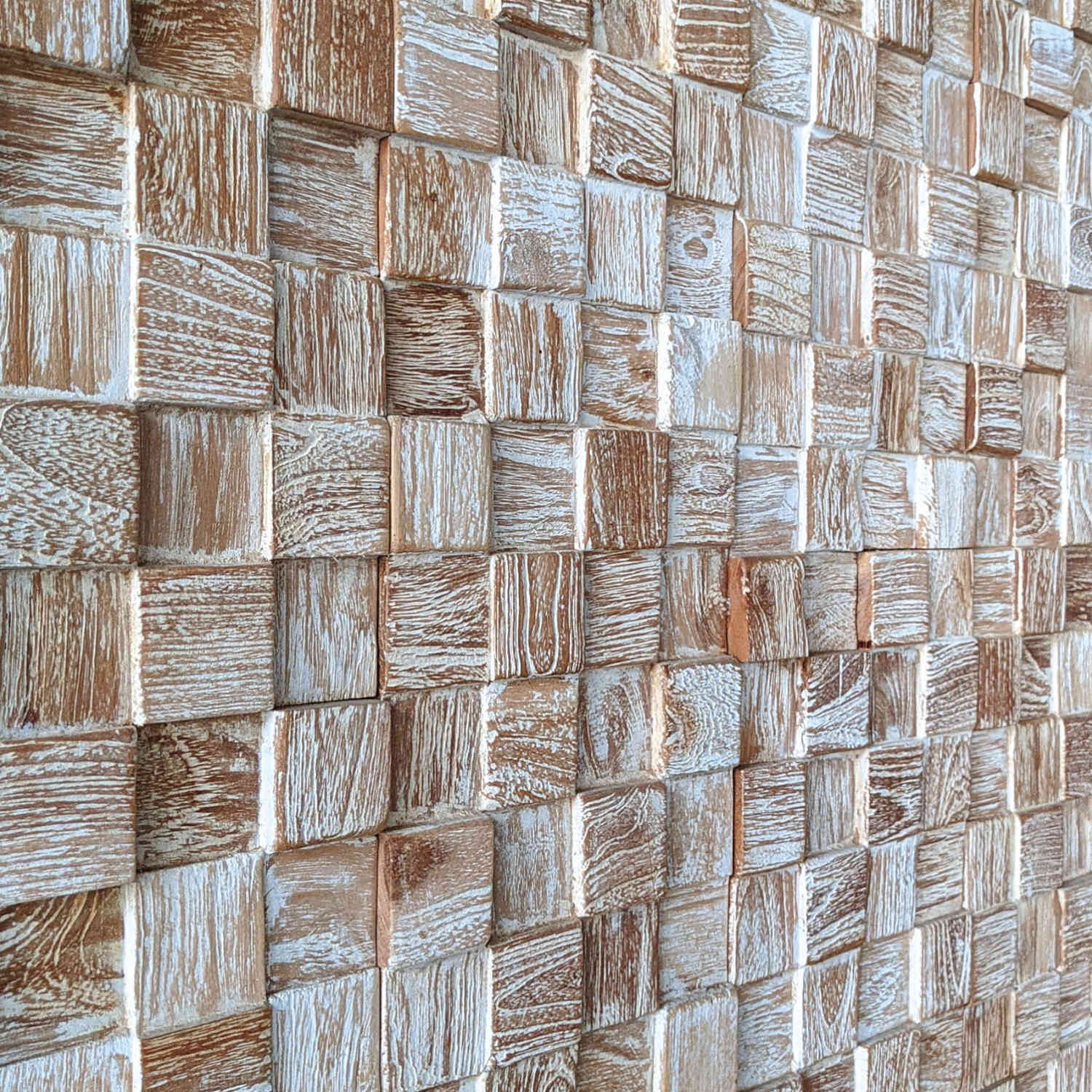 Rivestimento murale unico Cubo lavato bianco realizzato in vero teak riciclato.