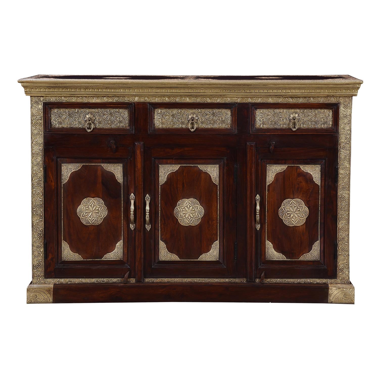 Il nostro orientale Cassettiera Diar marrone composto da Legno di sheesham era dentro artigianato di alta qualità fabbricato. Quelli color oro Applicazioni in ottone sui cassetti e sul bordo superiore della cassettiera questi sono particolarmente particolari nobile e lussuoso apparire.