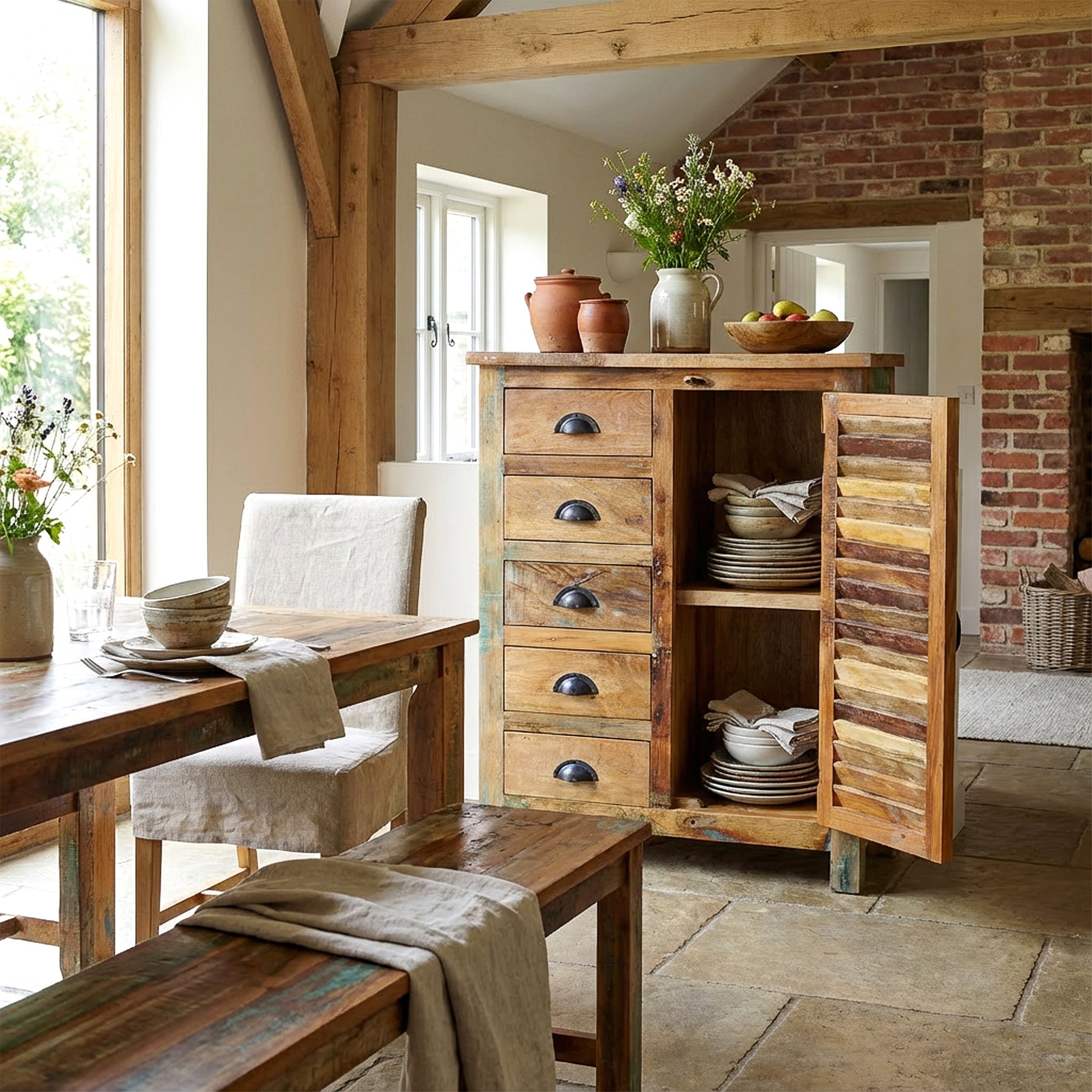 Il carattere di questa credenza è chiaramente radicato nel vintage senza apparire nostalgico. Lo shabby chic e il raffinato look boho completano l'espressione, mentre lo stile rustico conferisce ai mobili la sua calma concreta. Tutto rimane riservato e autentico, sostenuto dal legno vecchio stesso, non da effetti decorativi.