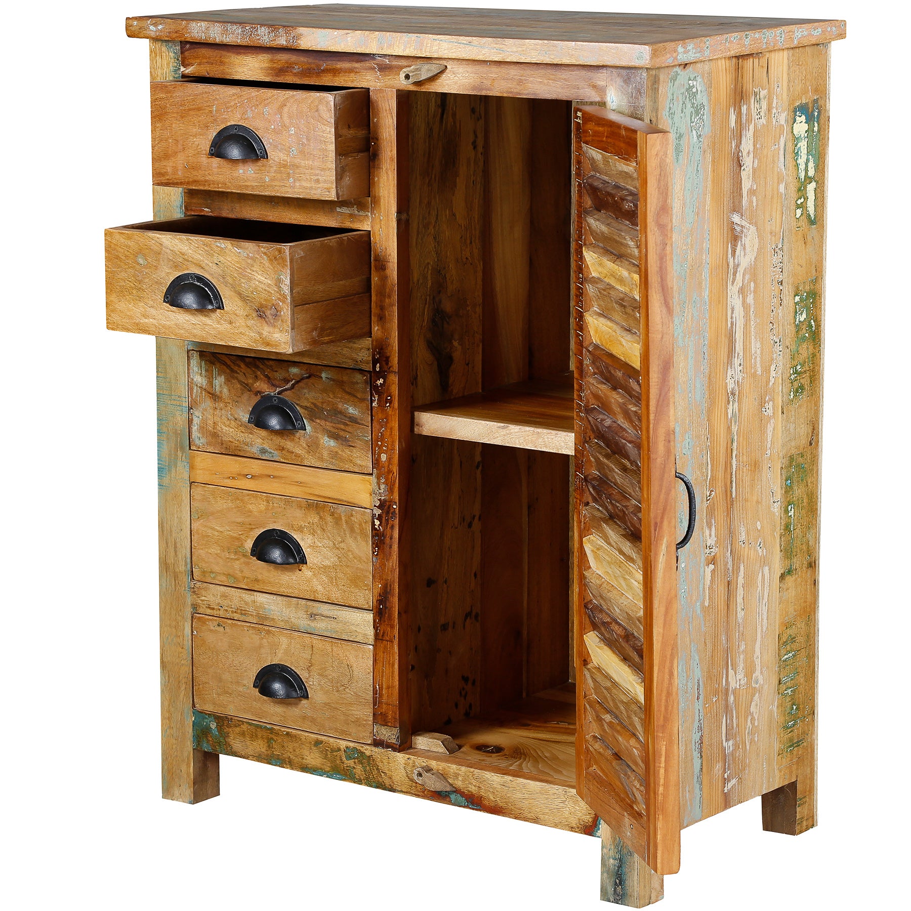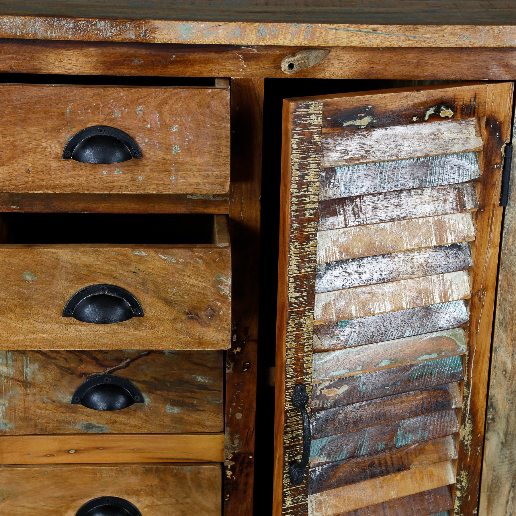 Realizzata in legno di mango riciclato, questa credenza è realizzata con legno che ha già avuto una vita. Il materiale proviene da alberi caduti, vecchie barche e travi, solai e travi di sostegno di edifici demoliti. Questa origine caratterizza il legno massiccio con tracce sottili, sfumature e una patina naturale che conferisce al carattere vintage un aspetto credibile e calmo.