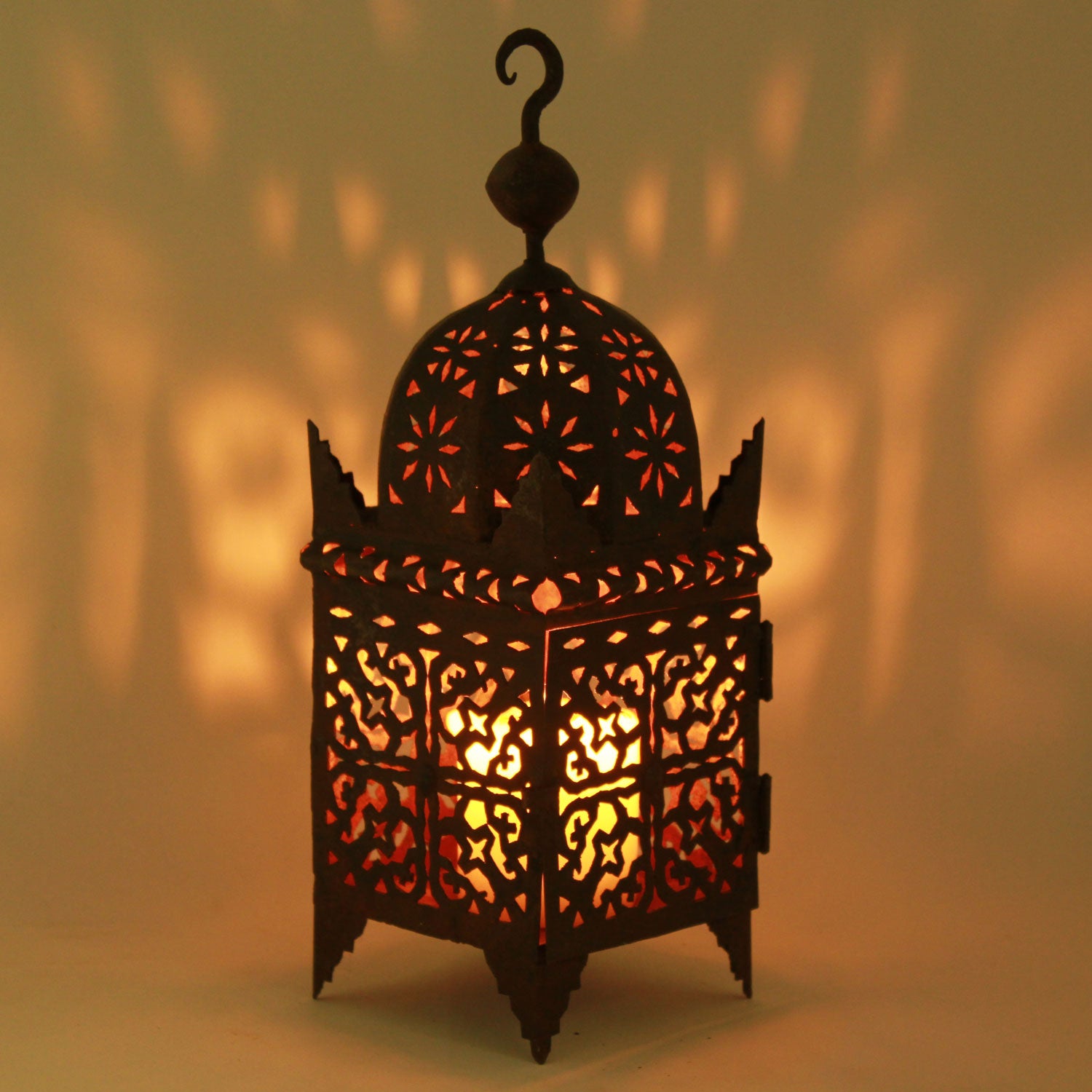 In reiner Handarbeit wurden mit Hammer und Meißel filigrane, orientalische Ornamente und Ausschnitte in das Metallgerüst eingearbeitet. Für elektrische und für Kerzenbeleuchtung geeignet. Eine kleine Tür mit Riegel lässt sich aufklappen, damit eine Fassung bzw. ein Leuchtmittel installiert werden kann.