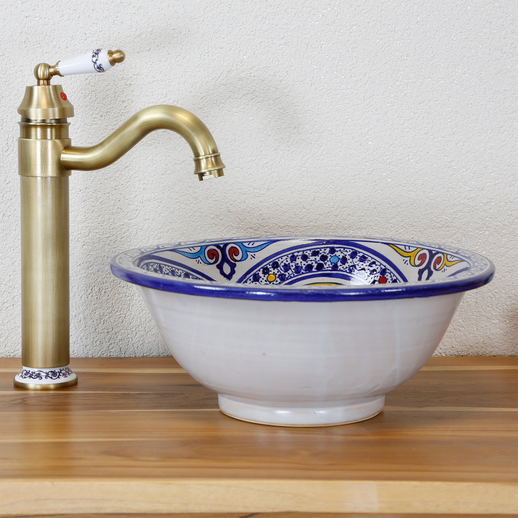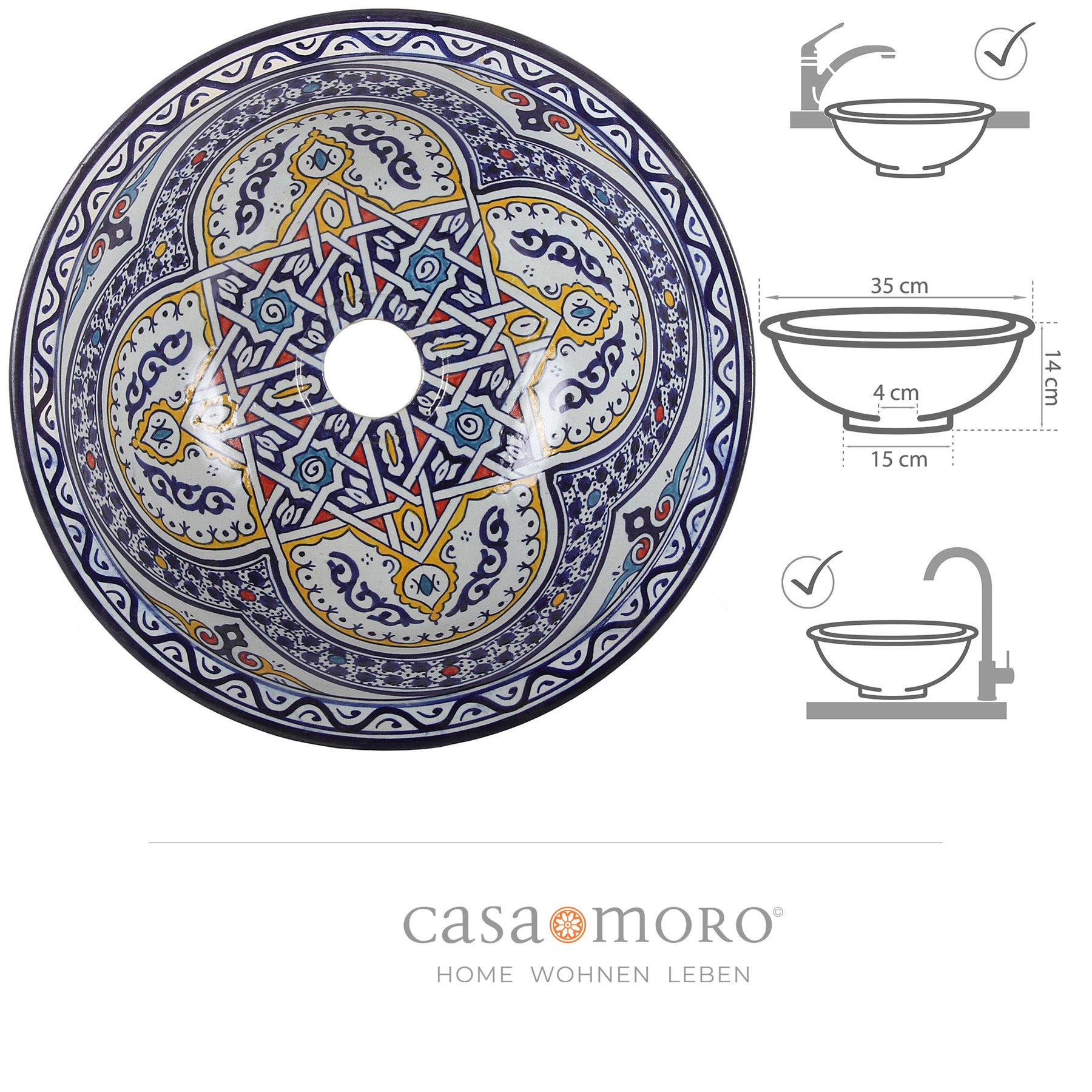 Questo lavabo rotondo da appoggio porta l'arte tradizionale della ceramica di Fes direttamente nel tuo bagno. La città marocchina è considerata un centro per la ceramica di alta qualità: è qui che vengono realizzati con cura artigianale lavabi che combinano perfettamente funzionalità e design. Ogni esemplare è davvero unico con una pittura artistica e un fascino senza tempo: un'attrazione per ogni bagno.