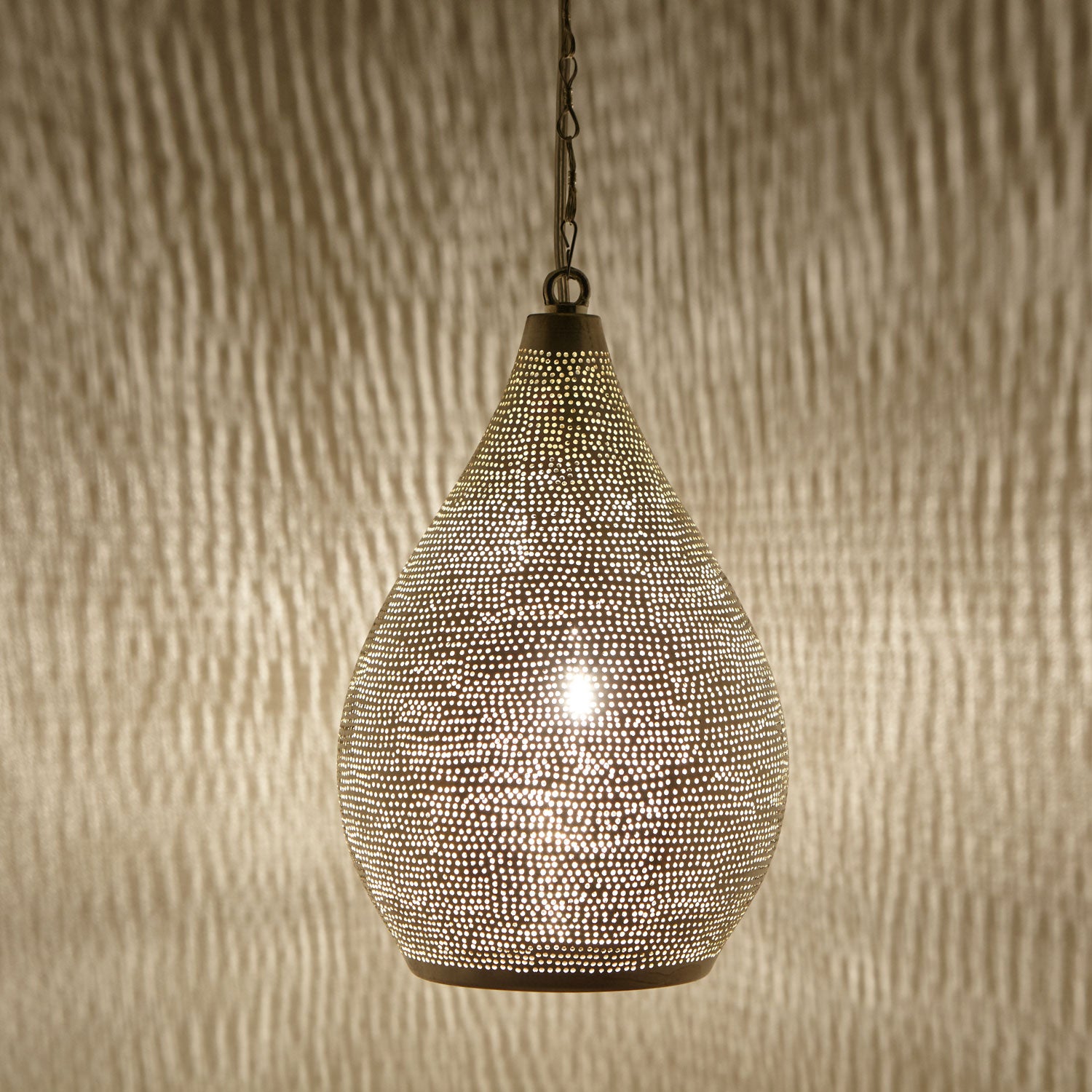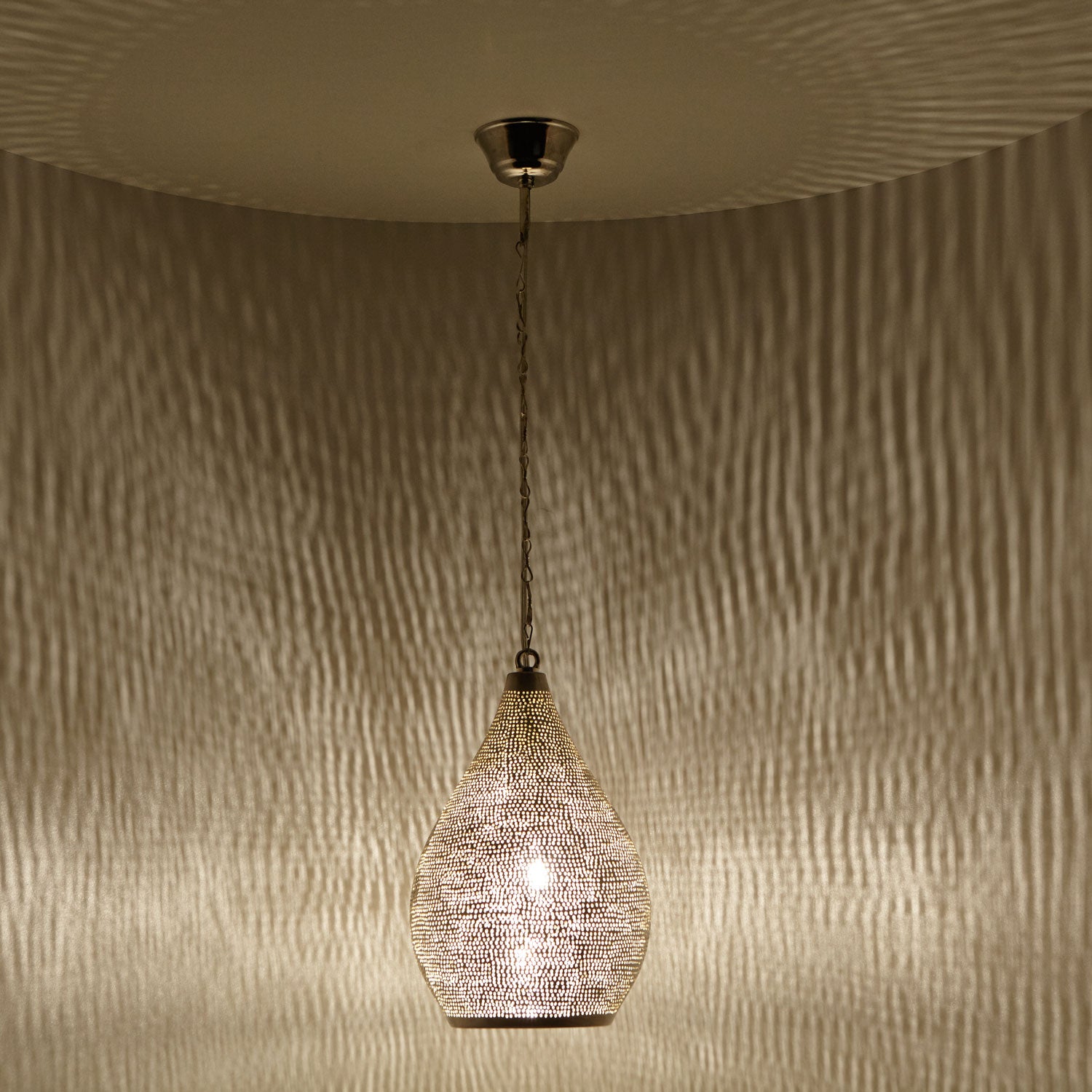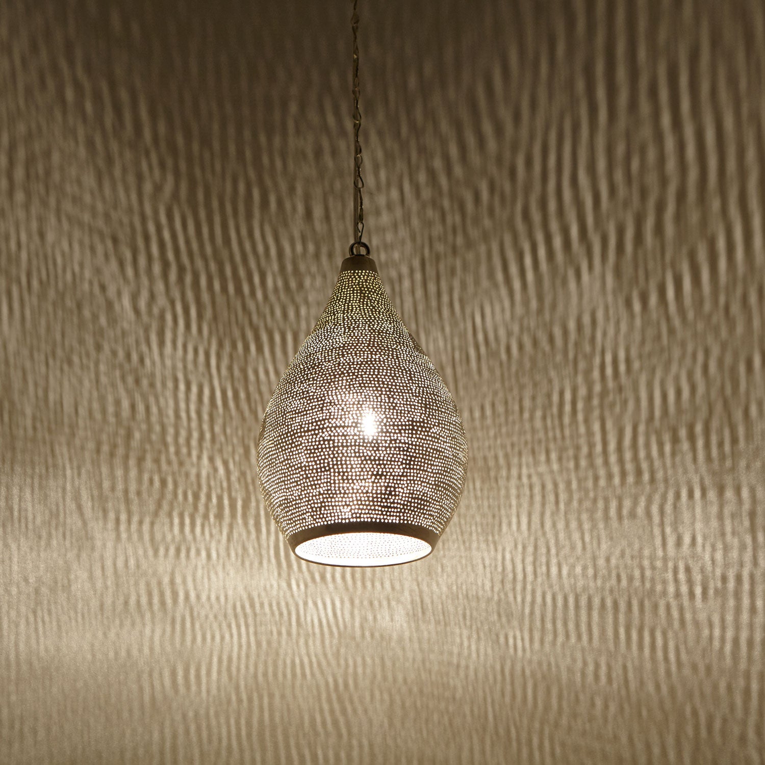 Die Hängelampe macht in jeder Ecke und in jedem Zimmer mit ihren verzaubernden Schattenwürfen eine gemütliche Atmosphäre! Ob über dem Esstisch, im Schlaf- oder Wohnzimmer, ob mediterran, orientalisch oder modern- mit unserer versilberten ägyptischen Lampe begeben Sie sich auf eine Reise in den Orient und lassen sich verzaubern mit filigranen Schatten – ein Hingucker der in ihrem Wohnbereich nicht fehlen darf!