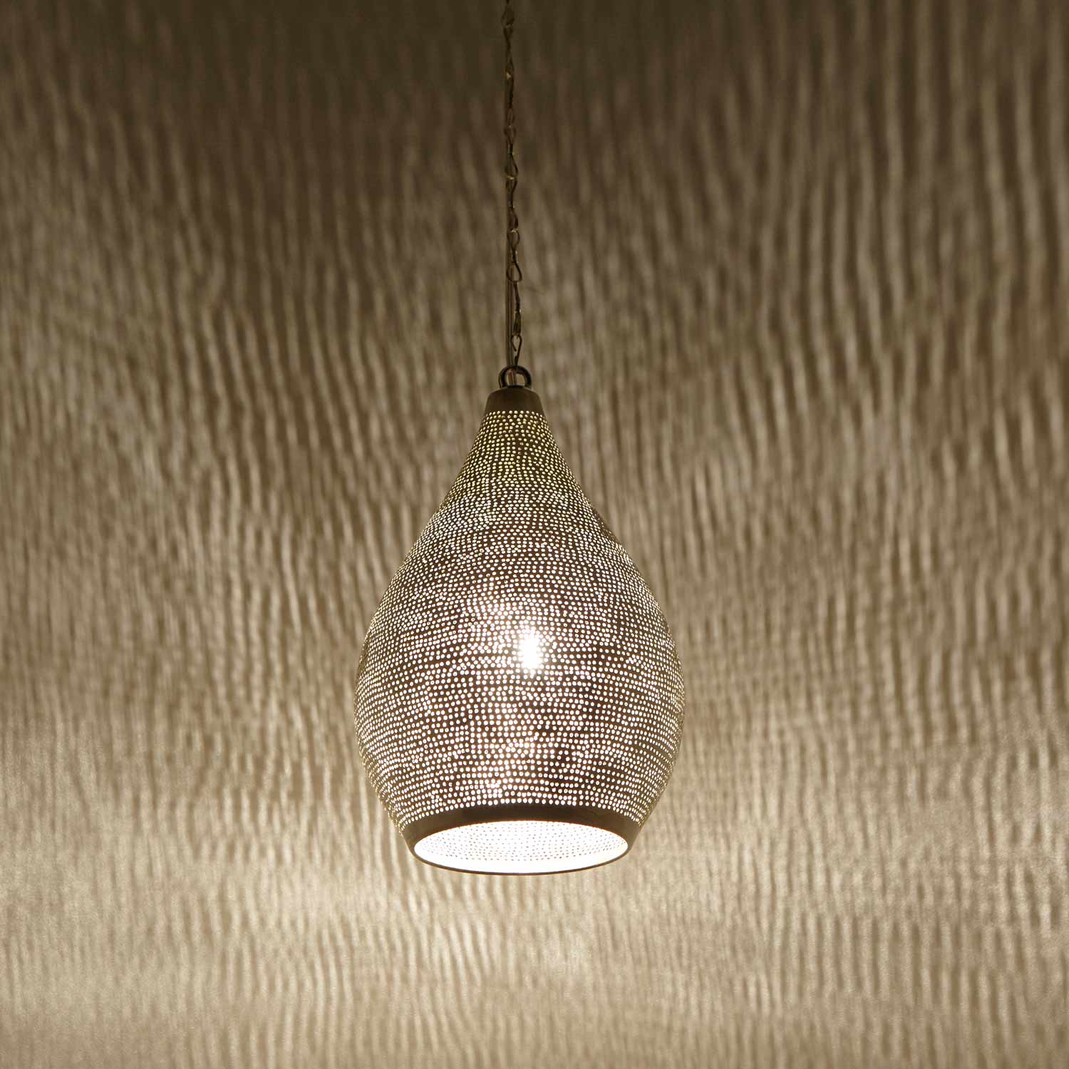 Unsere marokkanische Lampe Naouma Sada D20 ist eine wunderschöne orientalische Leuchte, welche sorgsam per Hand gefertigt wurde. Dieser Blickfang aus dem Orient passt durch das zeitlose gleichmäßige Muster perfekt in jedes Zimmer und wirkt durch das echte versilberte Messing besonders luxuriös!