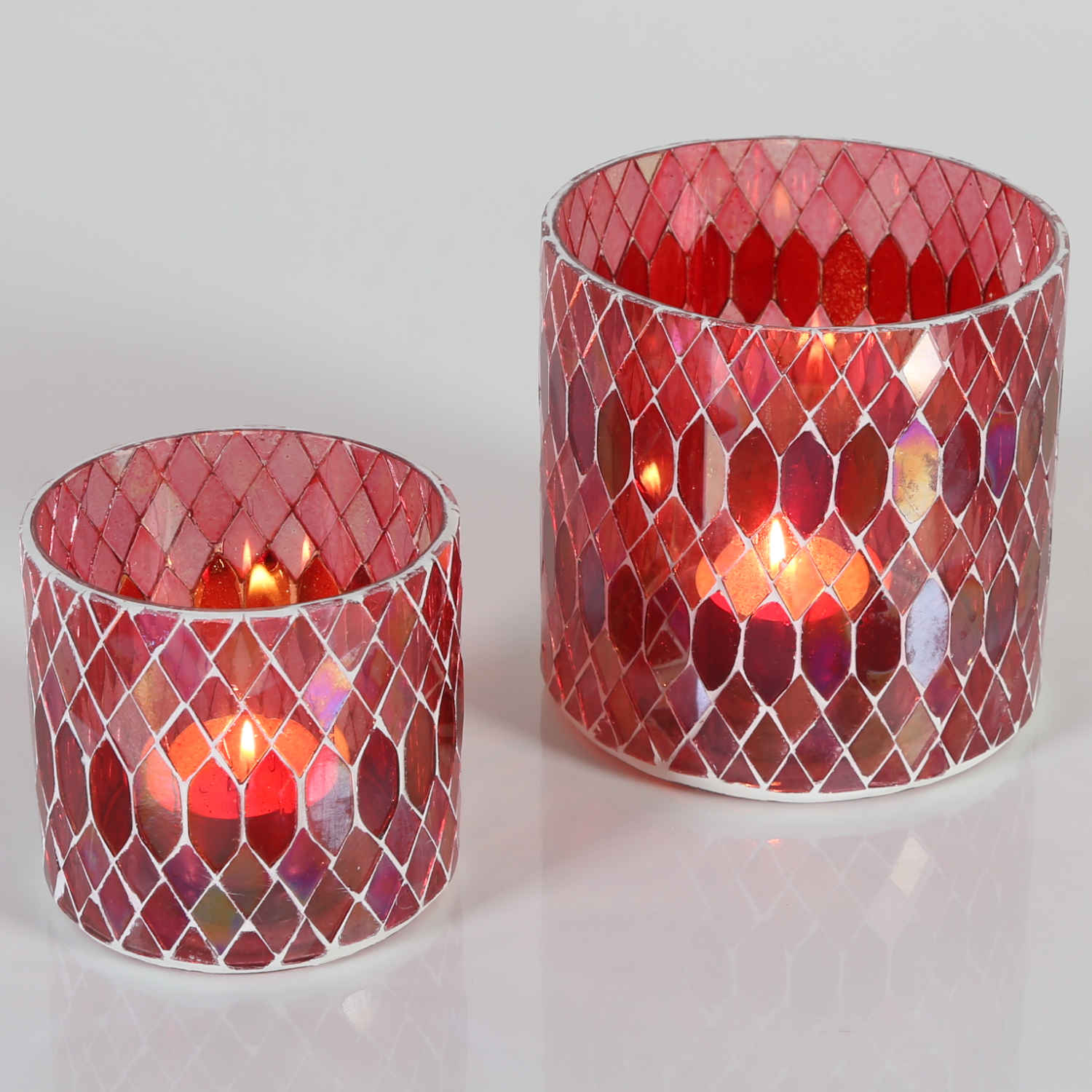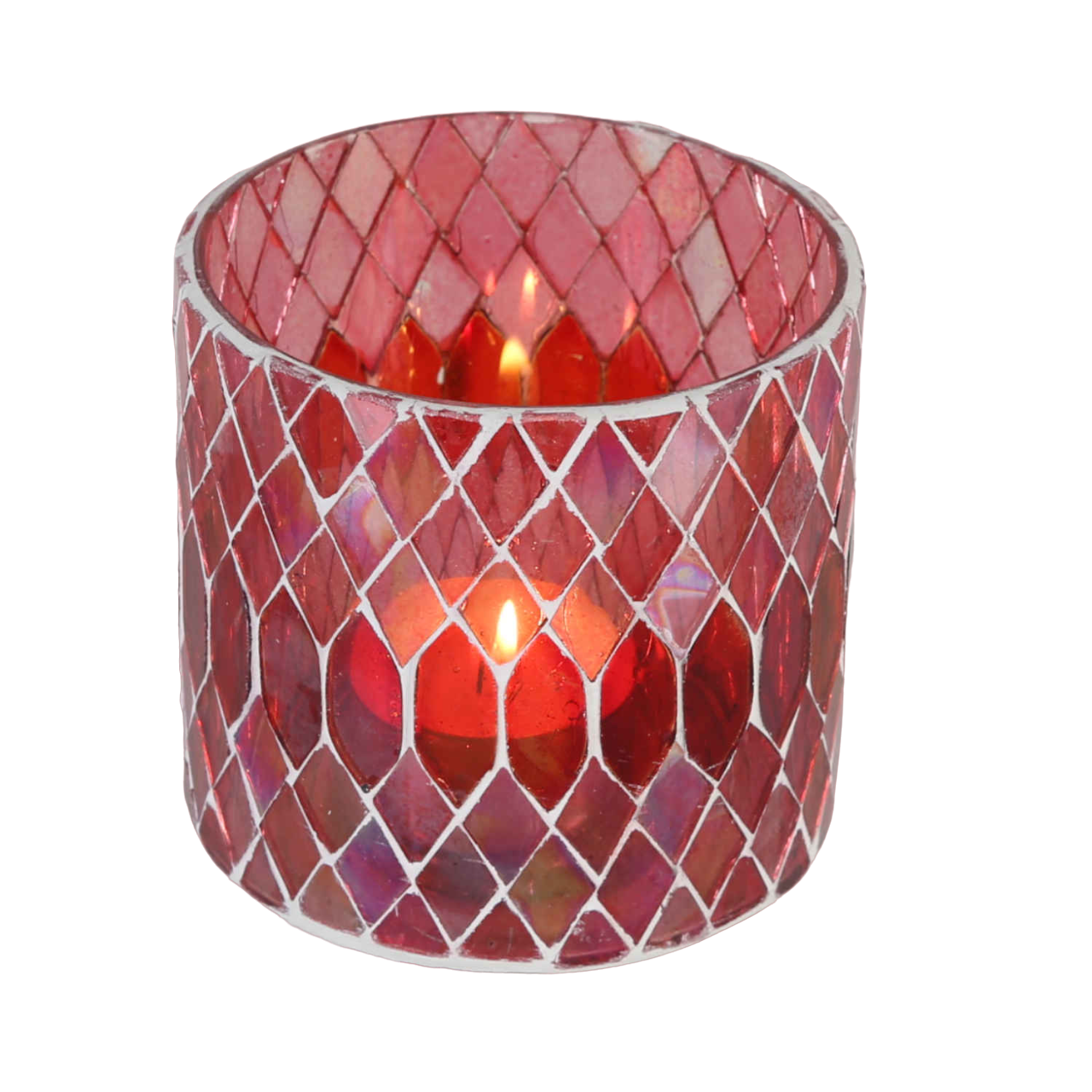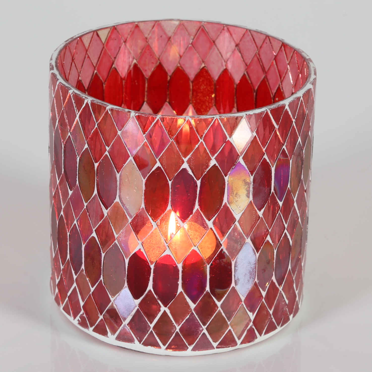 Dekoratives Mosaik Glas-Windlicht, Teelichthalter Rayan Rot. Die bunten Gläser sind außen mit kleinen Mosaik-Glassteinchen von Hand beschmückt, dadurch ist jedes Mosaik Glaswindlicht ein Unikat. Egal ob im Wohnzimmer als Tischdeko, auf der Terrasse als Gartenwindlicht, oder im Schlafzimmer als Stimmungslicht, oder als Kerzenständer in Ihrem Restaurant, Hotel, oder Lounge - die Mosaik-Windlichter sorgen immer für eine stimmungsvolle Atmosphäre und avancieren zum Deko-Highlight, dem sich keiner entziehen kann.