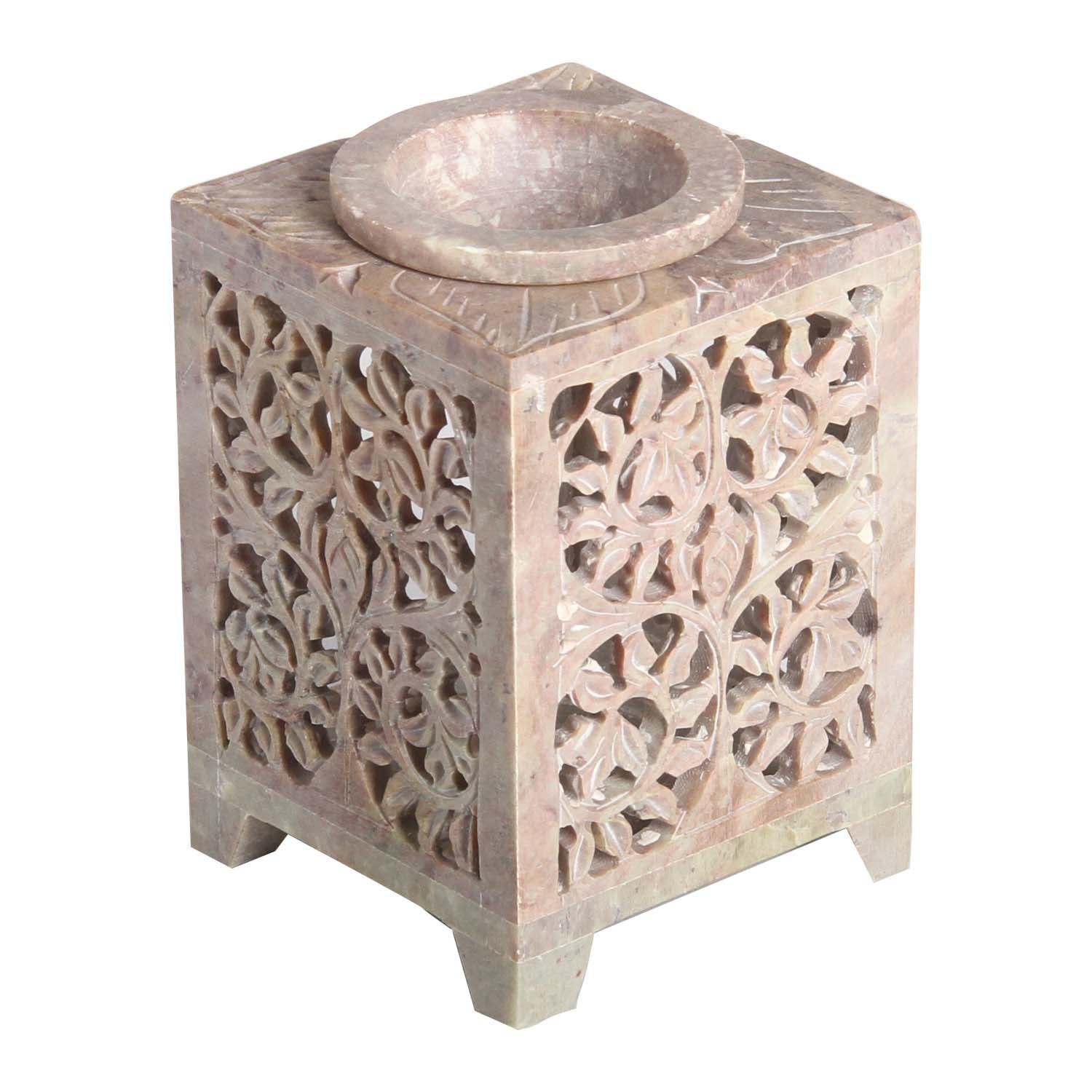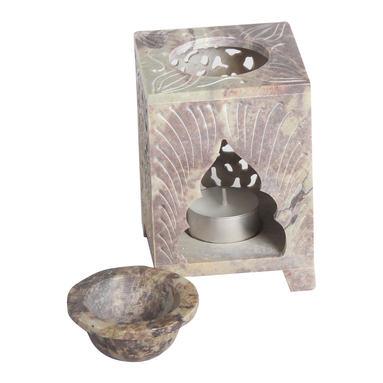 Handgefertigte Duftlampe Shiva aus Soapstone für Teelichtkerzen. Die filigranen Ornamente wurden traditionell von Hand in den Stein gearbeitet. Sowohl als Aroma-Lampe in der Aromatherapie auch als dekorativer Teelichthalter macht unsere Duftlampe eine gute Figur, und schafft mit Ihren Schattenwürfen eine erholsame Atmosphäre. Gemeinsam mit aromatischen Duftölen erzeugt sie eine behagliche Stimmung. Perfekt für Ihre Meditation Stunde, Yoga oder Spa.