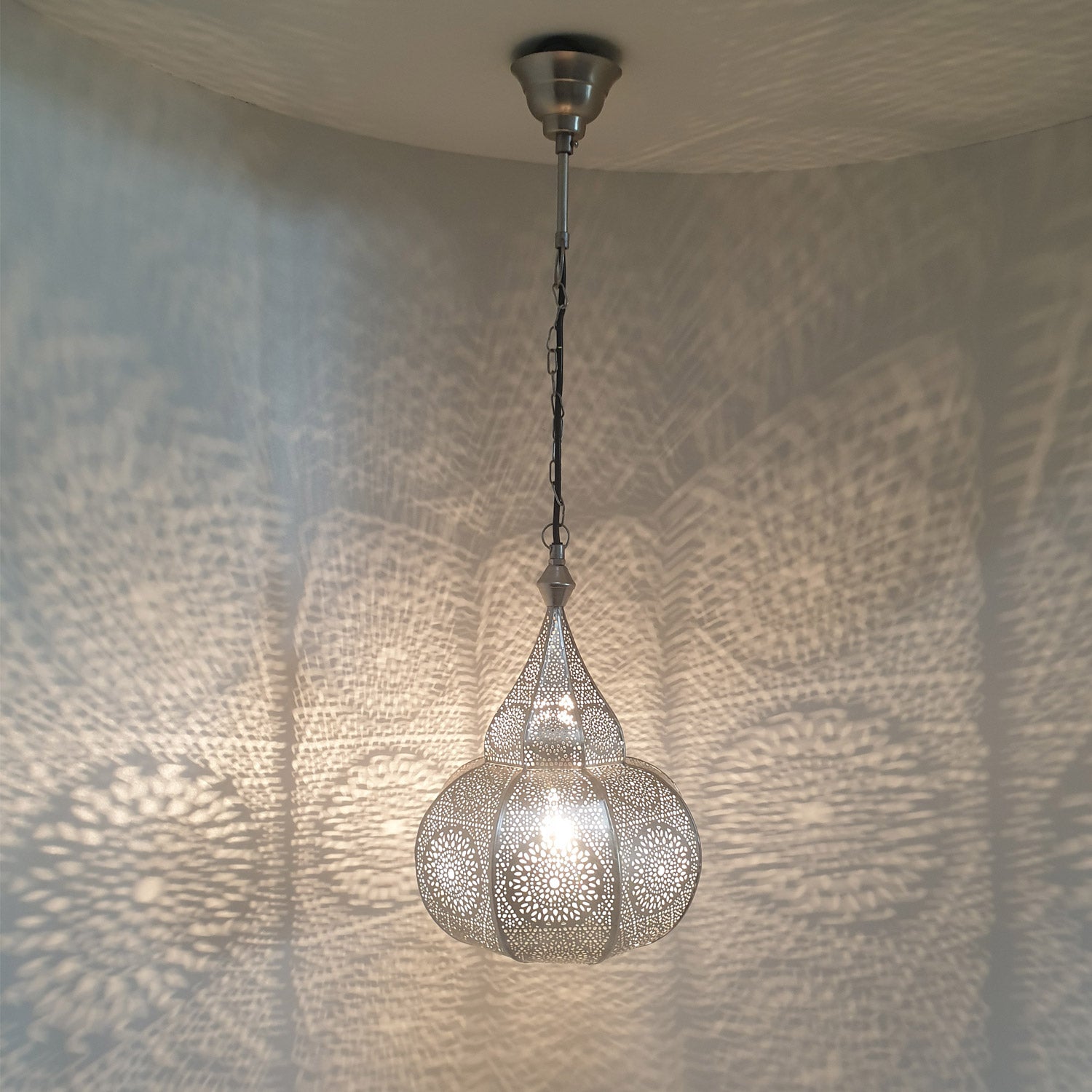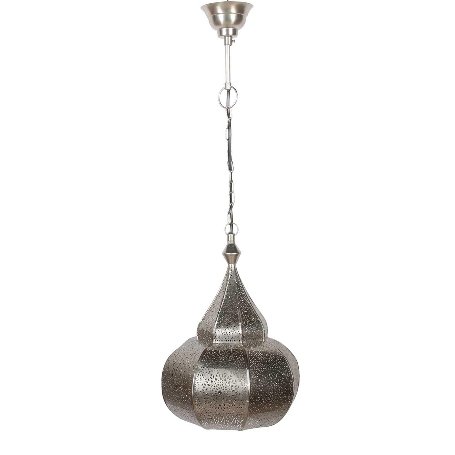 Die Pendelleuchte ist in von innen und außen in Silber lackiert. Sie erhalten diese orientalische Leuchte mit Aufhängekette, Baldachin, eine in der EU hergestellten Lampenfassung und einem passenden Kabel. Diese Lampe ist nur für die elektrische Beleuchtung geeignet.