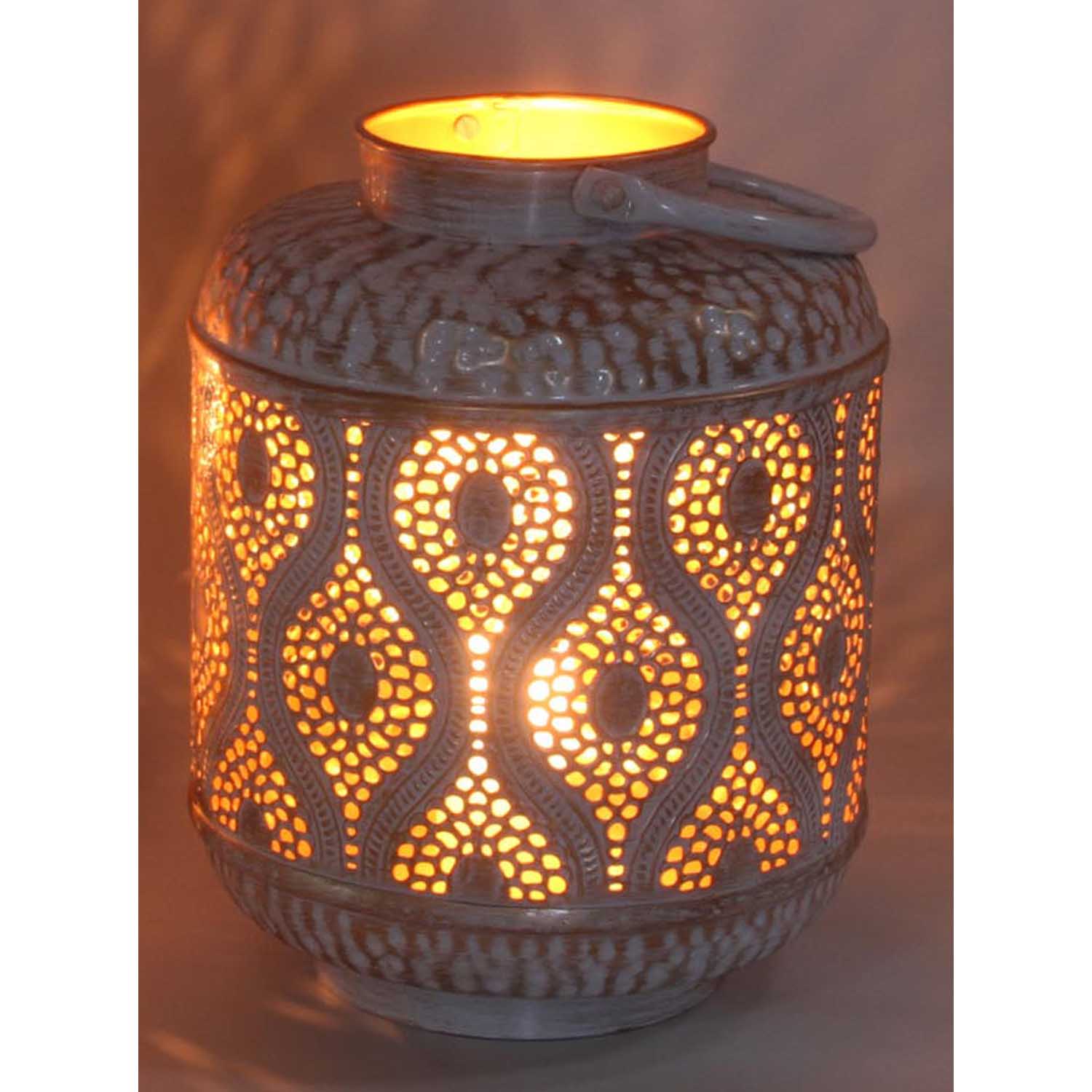Dieses orientalische Windlicht ist handgefertigt und besteht aus perforiertem Metall. Seine traumhaften Muster und Schattenspiele verzaubern jeden Raum.