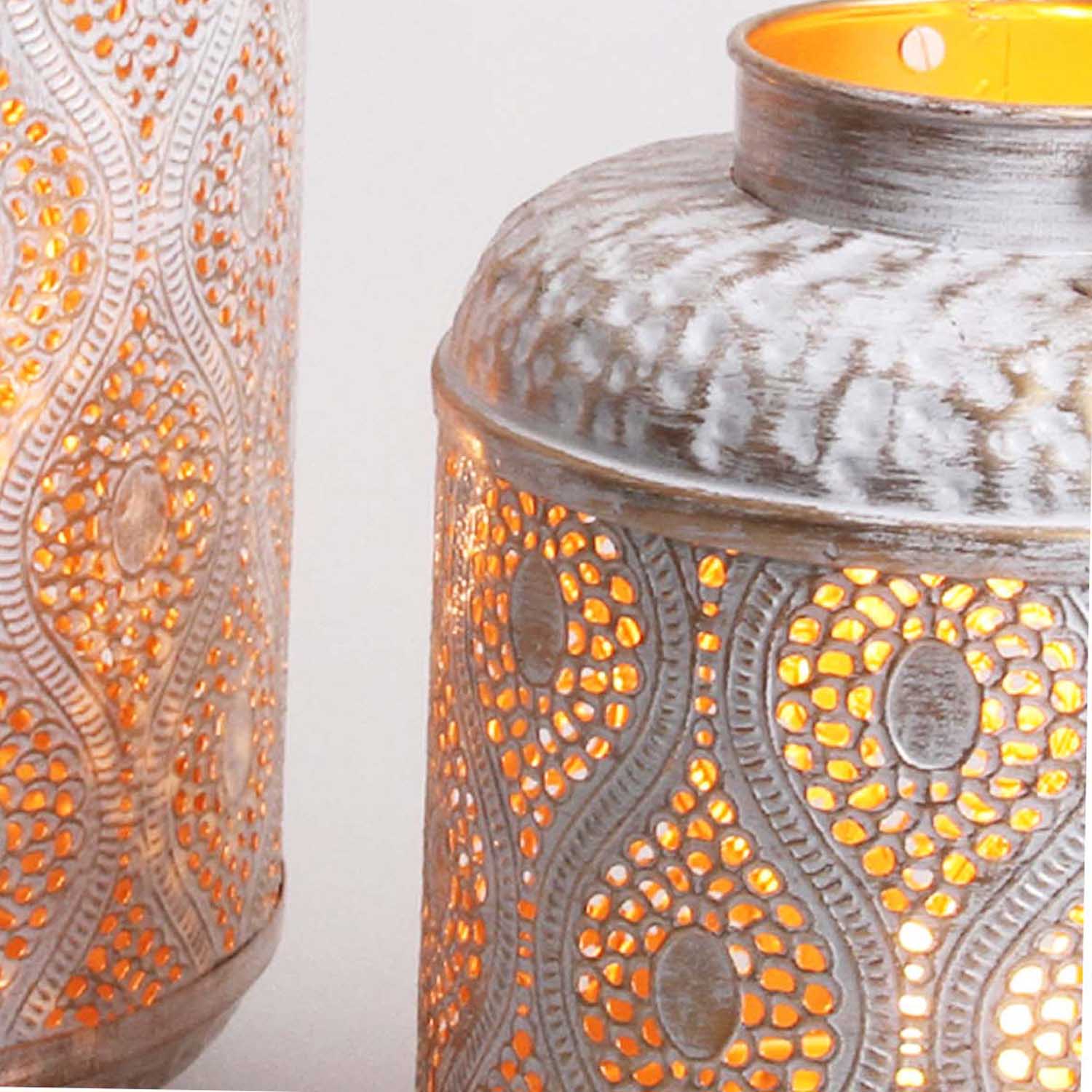 Unsere Laterne ist von innen in gold und aussen in weiß-gold lackiert. Im Inneren befindet sich genügend Raum um eine Kerze, Teelicht oder eine Lichterkette zu platzieren. Ob auf der Terrasse, im Haus oder im Garten, diese Laternen schaffen eine sehr schönes orientalisches Ambiente.