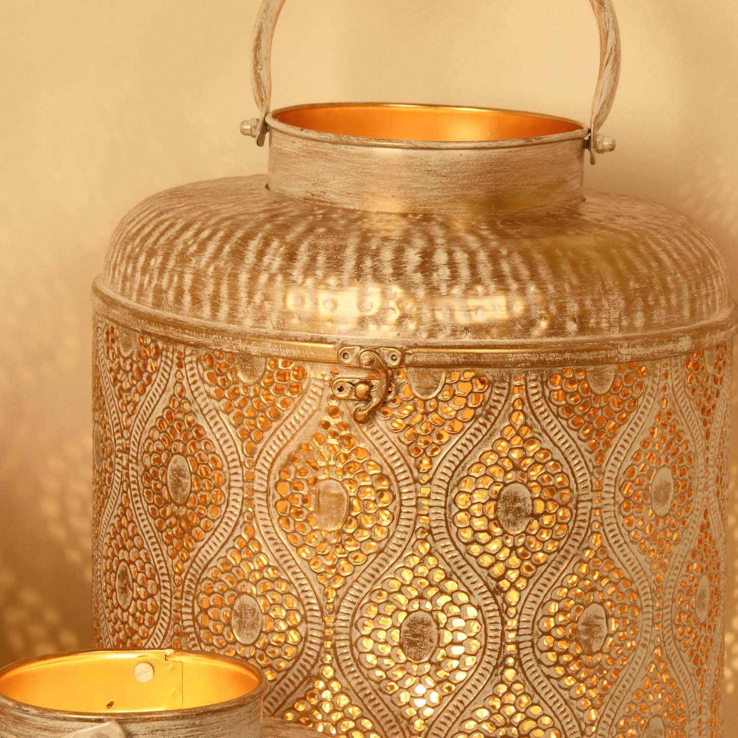 Unsere Laternen sind von innen in gold und aussen in weiss-gold lackiert. Im Inneren befindet sich genügend Raum um Kerzen, Teelichter oder eine Lichterkette zu platzieren. Ob auf der Terrasse, im Haus oder im Garten, diese Laternen schaffen eine sehr schönes orientalisches Ambiente.