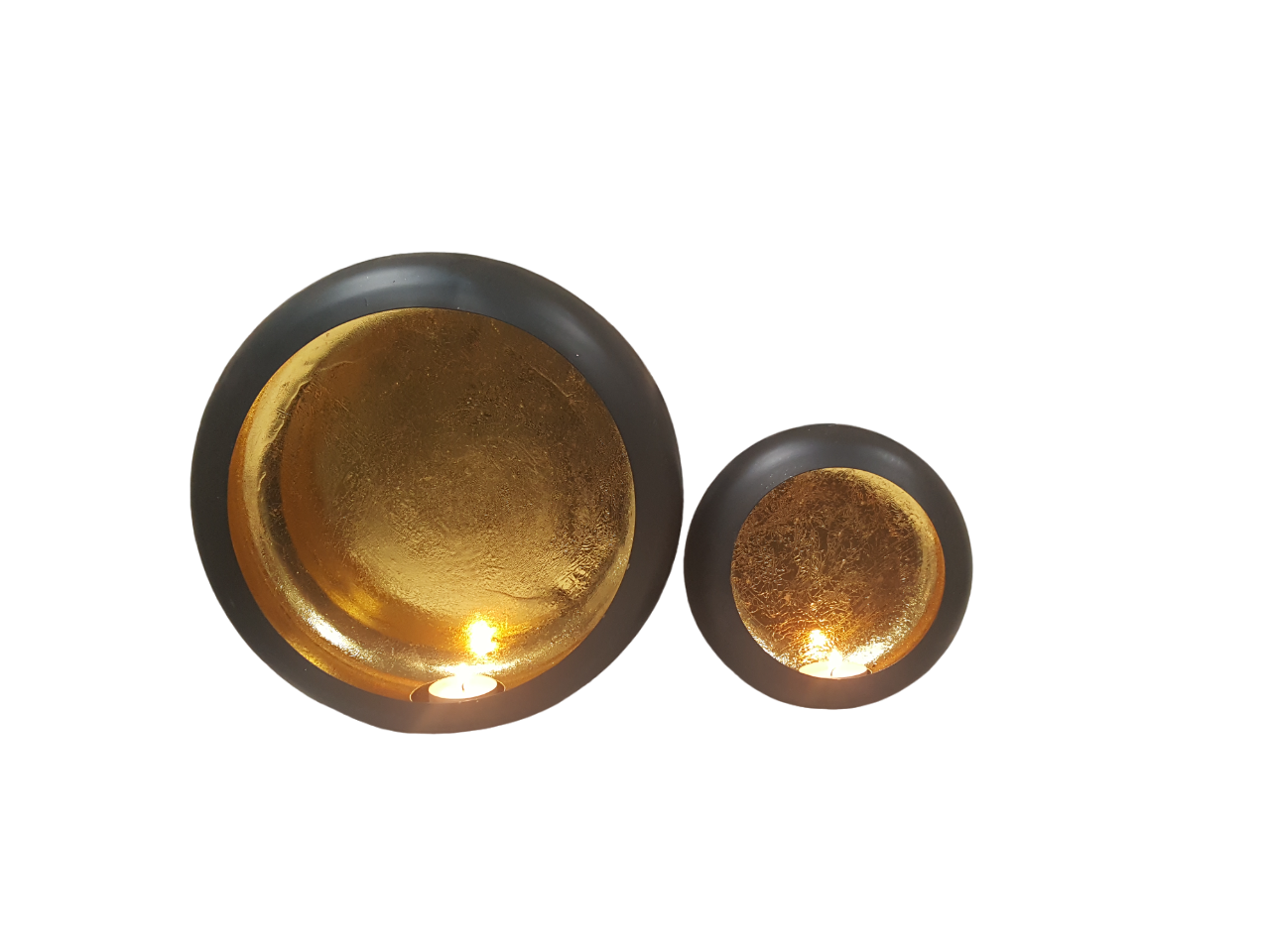 Die runden Wandkerzenhalter sind Außen in Schwarz lackiert und Innen mit Goldfolie ausgekleidet lackiert, somit wirkt der Untergrund "verknittert". Das Kerzenlicht wird mehrfach gebrochen, dadurch strahlen die Teelichthalter Wärme und Freundlichkeit aus und verbreitet eine stimmungsvolle Atmosphäre – Ideal für Abende zu zweit, mit Freunden und der Familie.