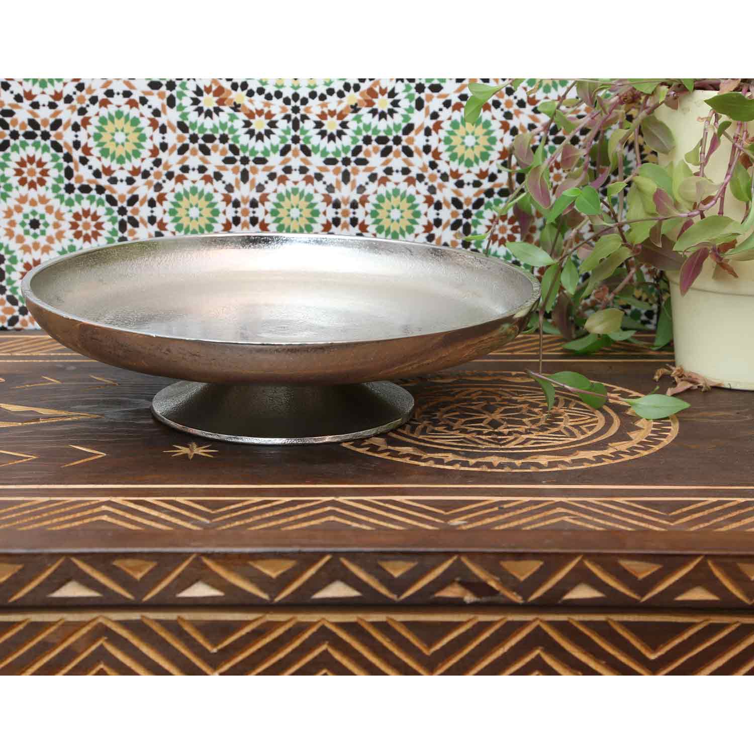 Il colore del vassoio tondo Livorno è argento. L'argento emana sempre un tocco di lusso ed eleganza, e si adatta senza problemi a qualsiasi zona living. Sia come piatto da torta o piatto da torta in cucina, come piatto da portata in soggiorno, come piatto da frutta in sala da pranzo o come piatto Piatto decorativo per la prossima celebrazione, matrimonio, compleanno o Natale, questo vassoio da portata è un assoluto colpo d'occhio.