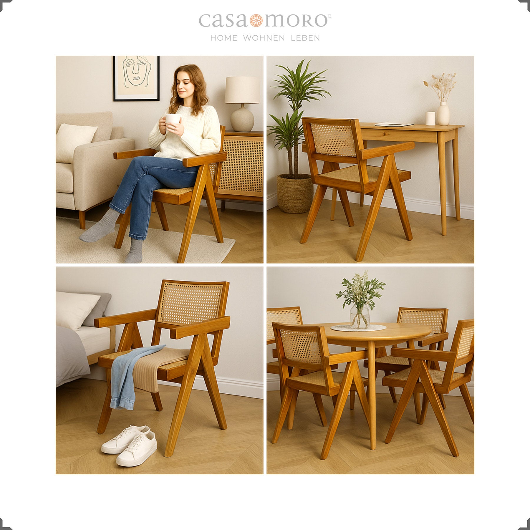 La poltrona con lavorazione in vimini viennese unisce l'autentico artigianato al design moderno. La solida struttura in teak appare scultorea e calda, mentre la seduta e lo schienale in rattan intrecciato garantiscono leggerezza e comfort. Il suo linguaggio formale chiaro ricorda i classici iconici del design e si adatta facilmente a un'ampia varietà di stili abitativi, dal moderno allo scandinavo.
