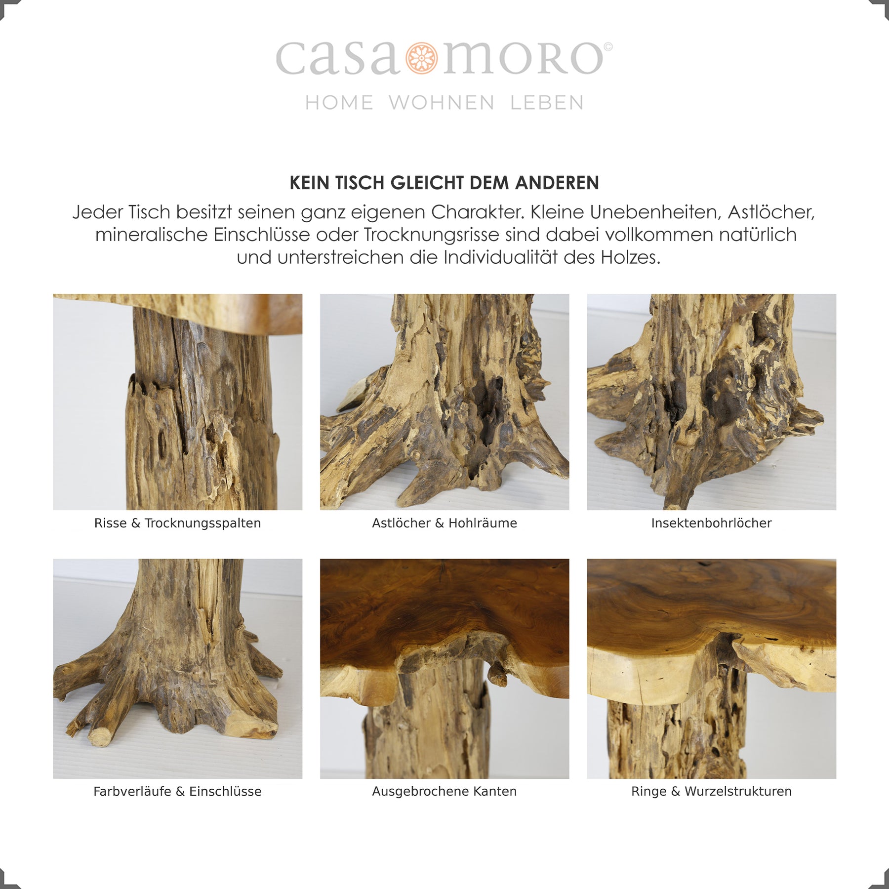 Il teak massiccio resiste all'umidità, acquista profondità nel tempo e mostra un carattere inconfondibile con le sue fessure naturali, gli anelli annuali e i nodi. Un tavolo da soggiorno per tutti coloro che apprezzano la naturalezza e amano la qualità.