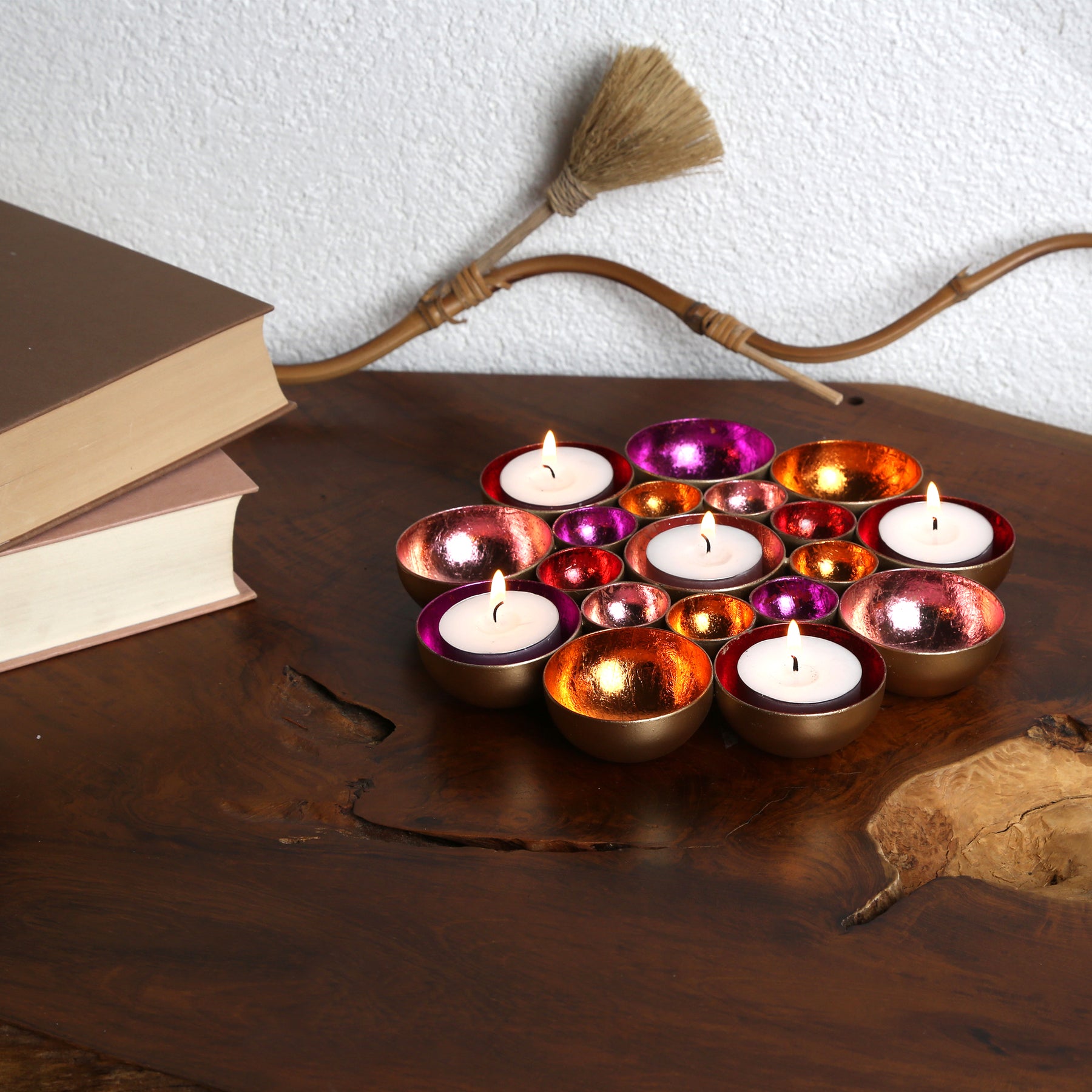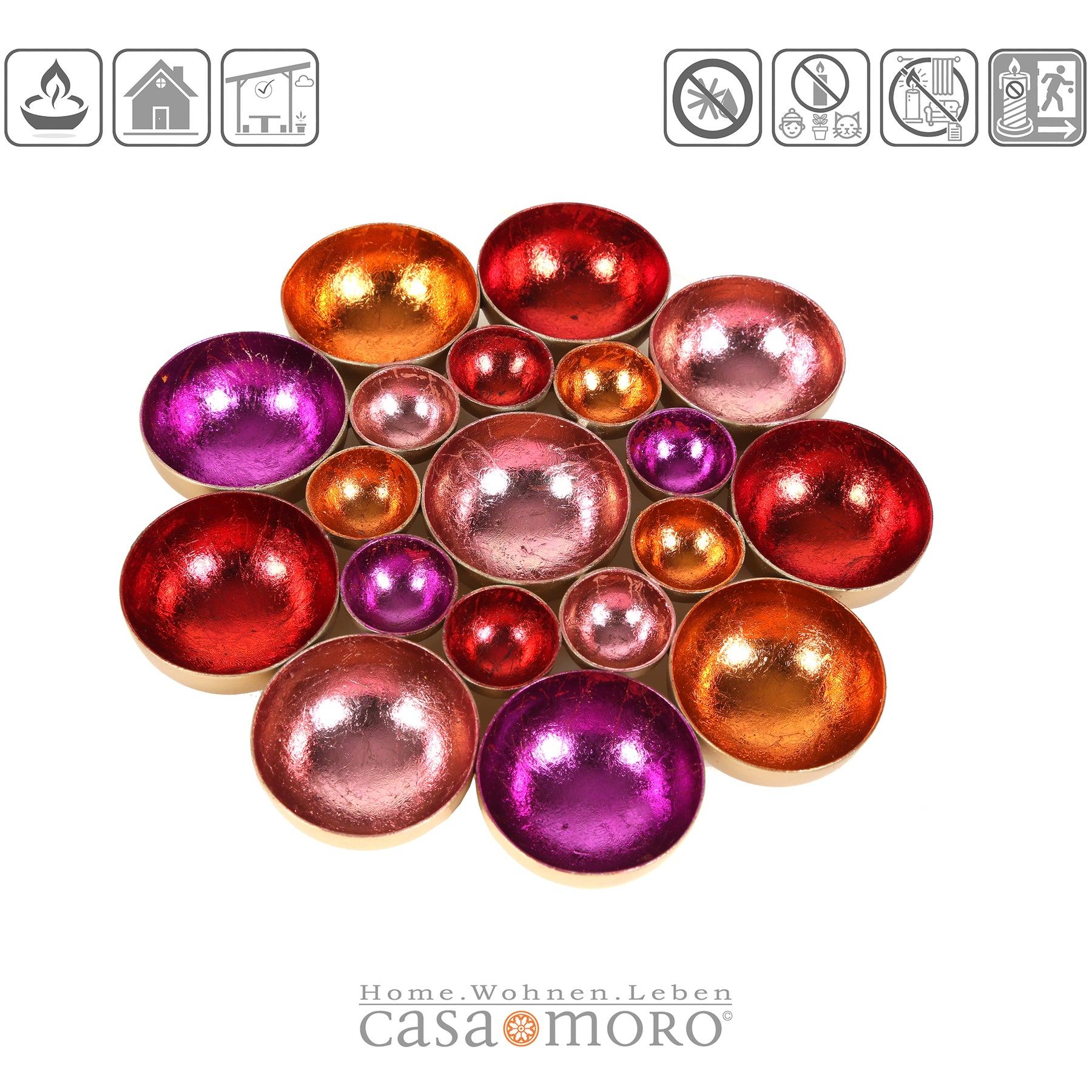 Blütenmeer aus Licht – Die handgefertigten Schalen in leuchtenden Farben sind zu einer wunderschönen Blume zusammengefügt und bringen eine einzigartige Lichtstimmung in dein Zuhause. Diese Dekoschale vereint kunstvolle Handarbeit und glamouröse Eleganz: Aus Metall gefertigt und innen in lebendigen Farben wie Gold, Rot, Pink, Rosa und Orange veredelt, reflektiert sie das Licht auf faszinierende Weise und schafft eine warme, einladende Atmosphäre.