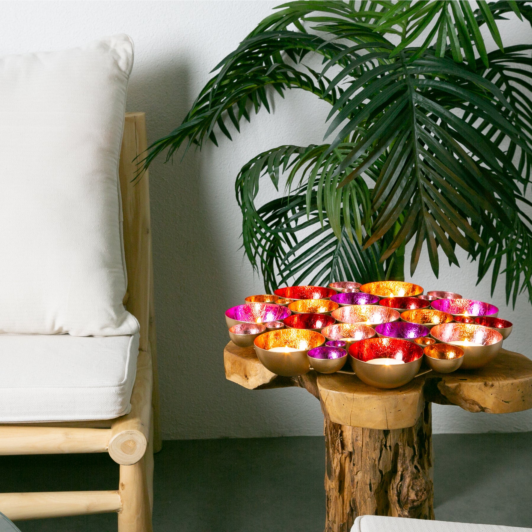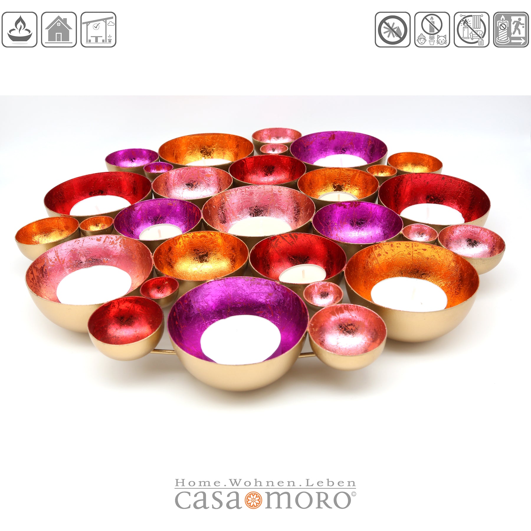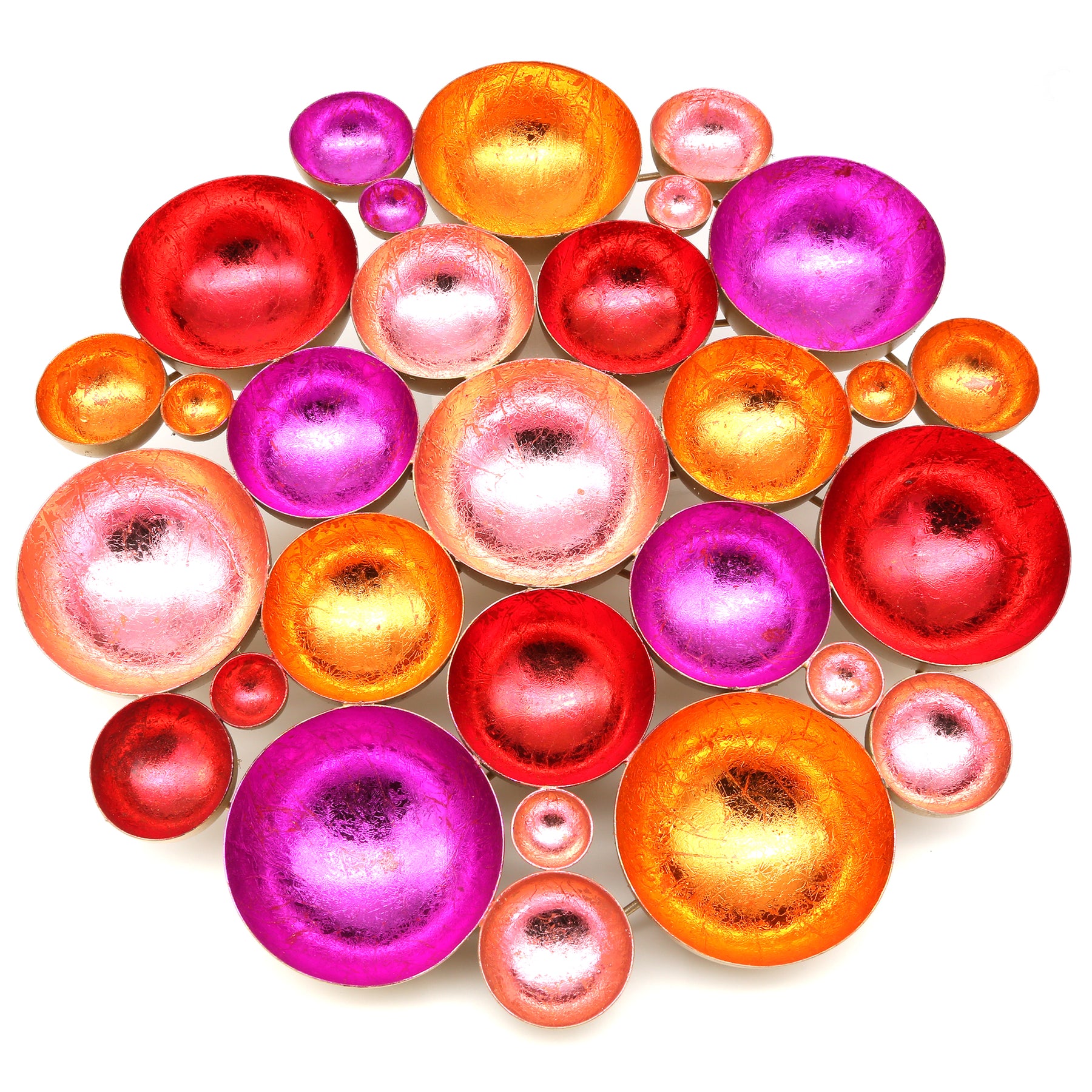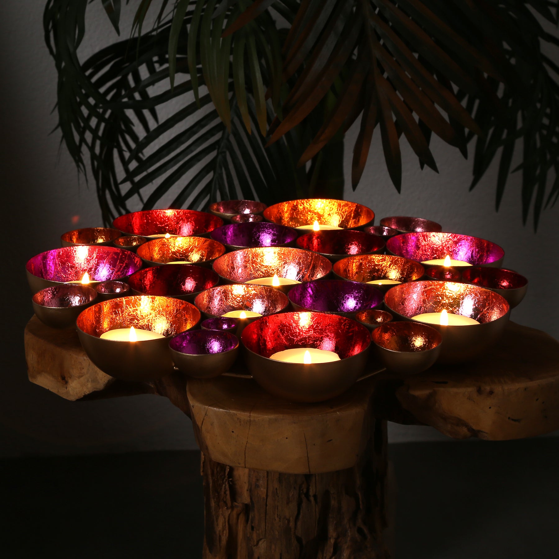 Blütenmeer aus Licht – Die handgefertigten Schalen in leuchtenden Farben sind zu einer wunderschönen Blume zusammengefügt und bringen eine einzigartige Lichtstimmung in dein Zuhause. Diese Dekoschale vereint kunstvolle Handarbeit und glamouröse Eleganz: Aus Metall gefertigt und innen in lebendigen Farben wie Gold, Rot, Pink, Rosa und Orange veredelt, reflektiert sie das Licht auf faszinierende Weise und schafft eine warme, einladende Atmosphäre.